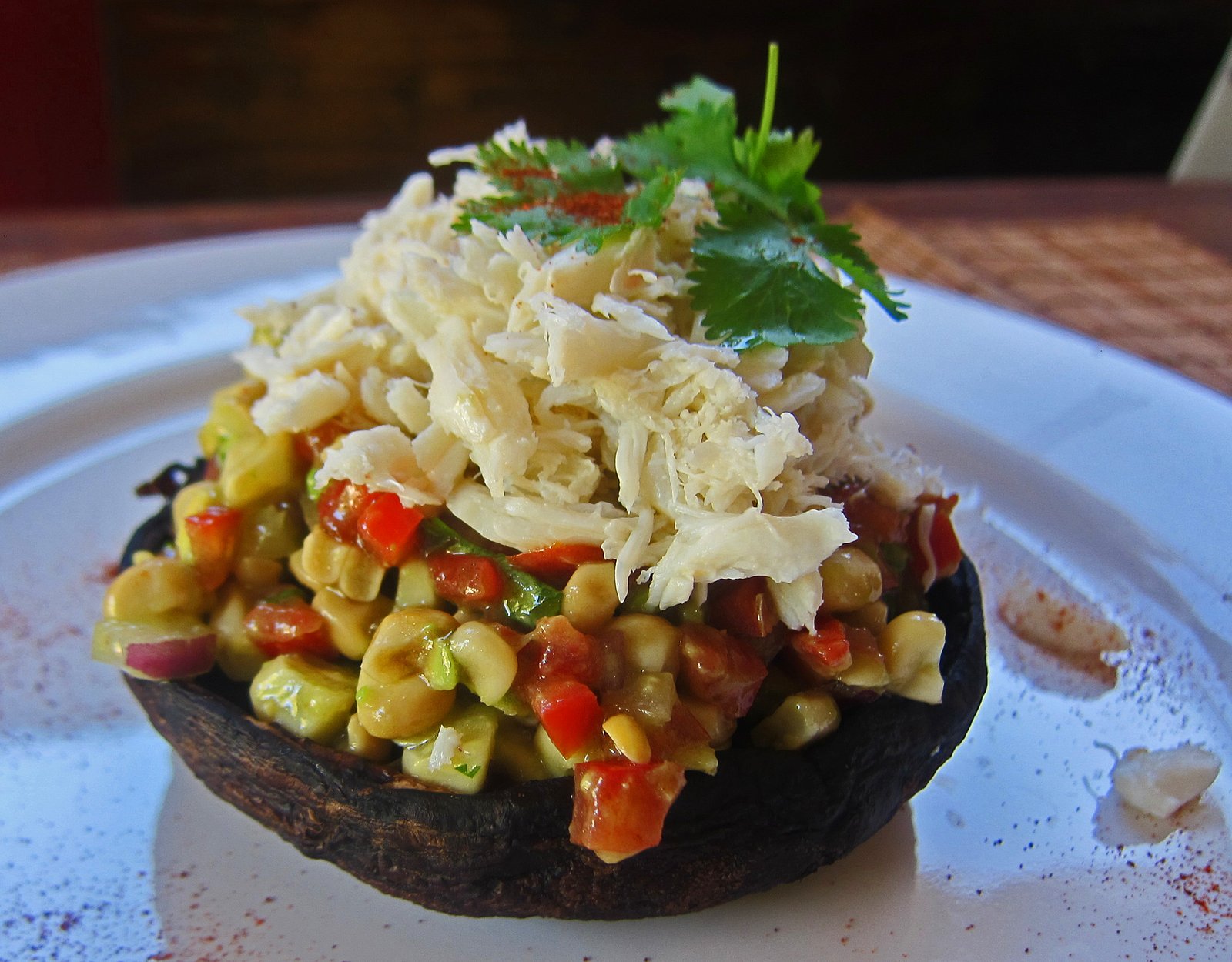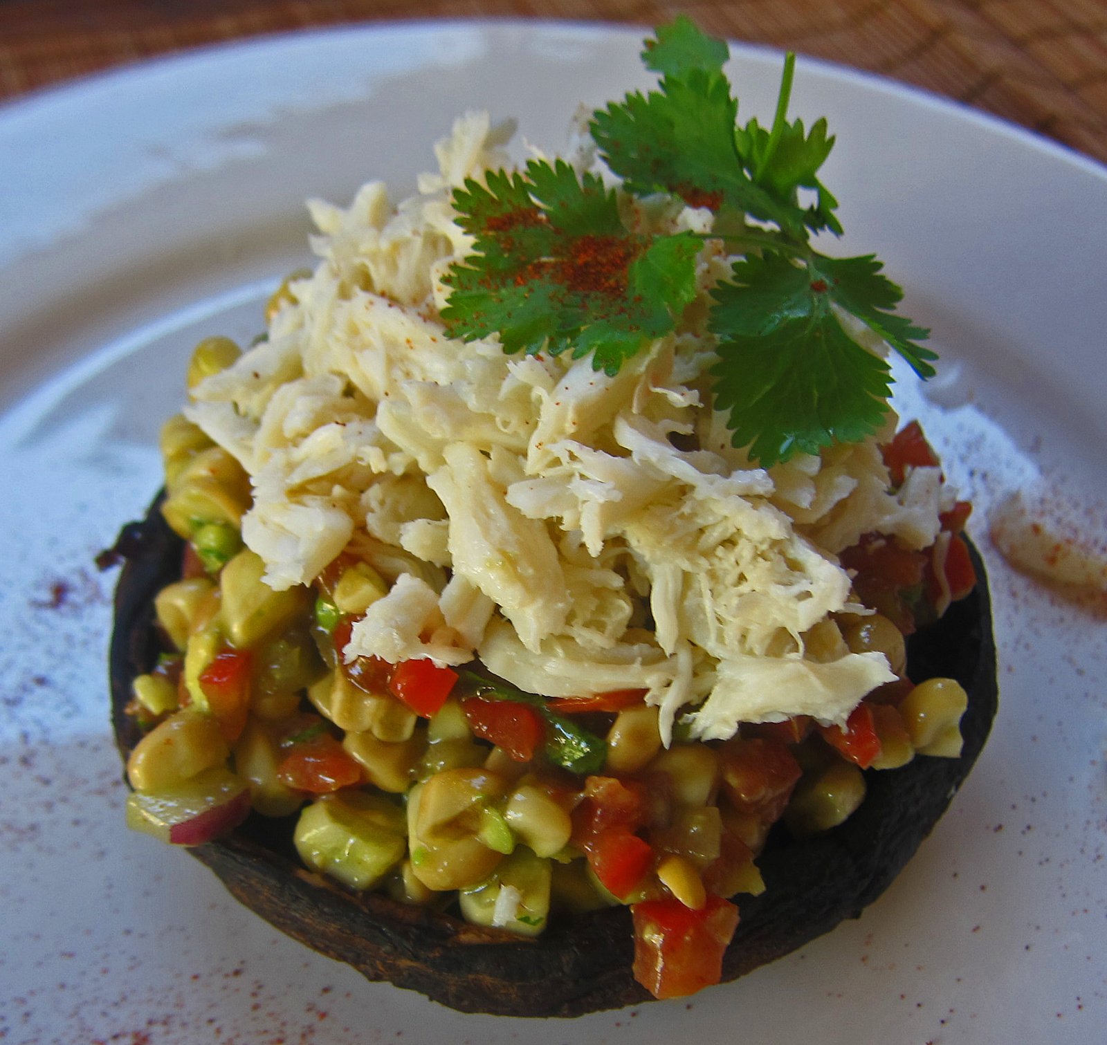 Still, the Missus loves Her smoked corn…… So I tried to think of something I'd really never made before and decided to smoke some portobello mushrooms. Of course there's the smoked corn. I ended up making a sort of salad/salsa/relish using the smoked corn, avocado, tomato, and red onion. And what goes better with corn and avocado than some crab meat….it was a nice exercise in cleaning out what I had in the fridge and came out pretty good as well.
