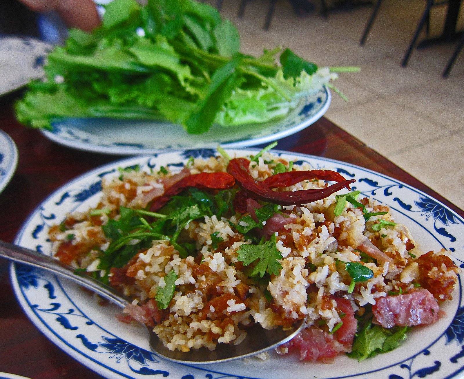 You know, Nye has a wonderful looking recipe for this on her blog, but I just can't bring my self to make this. I guess making this would eliminate the air of mysterious wonderfulness that dish provides….so I just avoid it. what I really enjoy about this version is that's it is less salty and probably quite low on the MSG scale if there's any in it at all. You can make out the coconut, the sour sausage, the nuttiness of the fried rice……