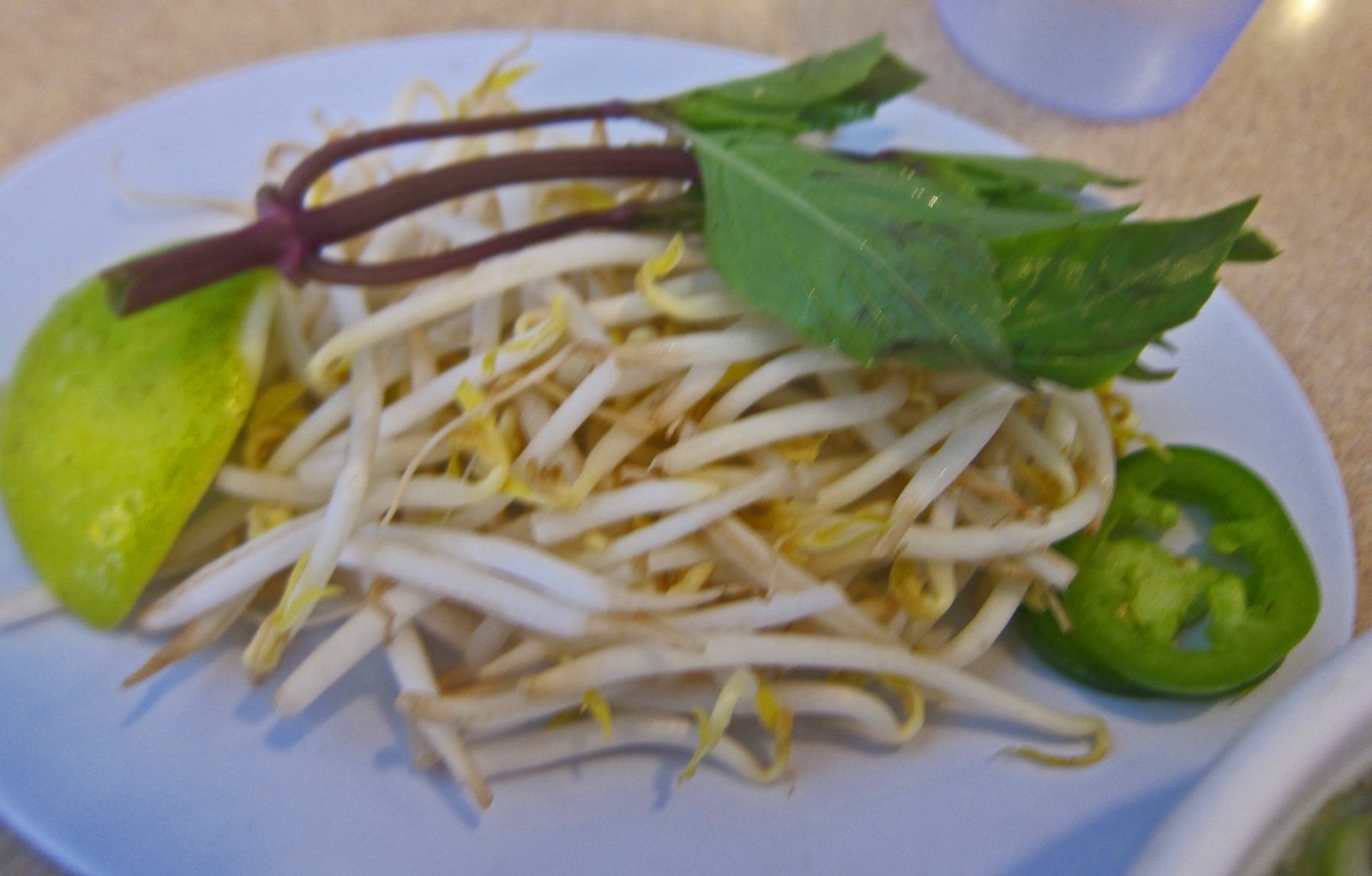 I ordered the #2 regular (well done steak, flank, fattyConvoyPhoNoodleREv03brisket, tendon, and tripe $5.65). Second bad omen, the first plate of garnishes arrived and looked like we were suffering from a basil shortage here in San Diego…….really, I got more basil and bean sprouts with my pho in Madison Wisconsin! So I asked if I could have a bit more basil and perhaps some Ngo Gai. The guy grunted and removed the entire plate……