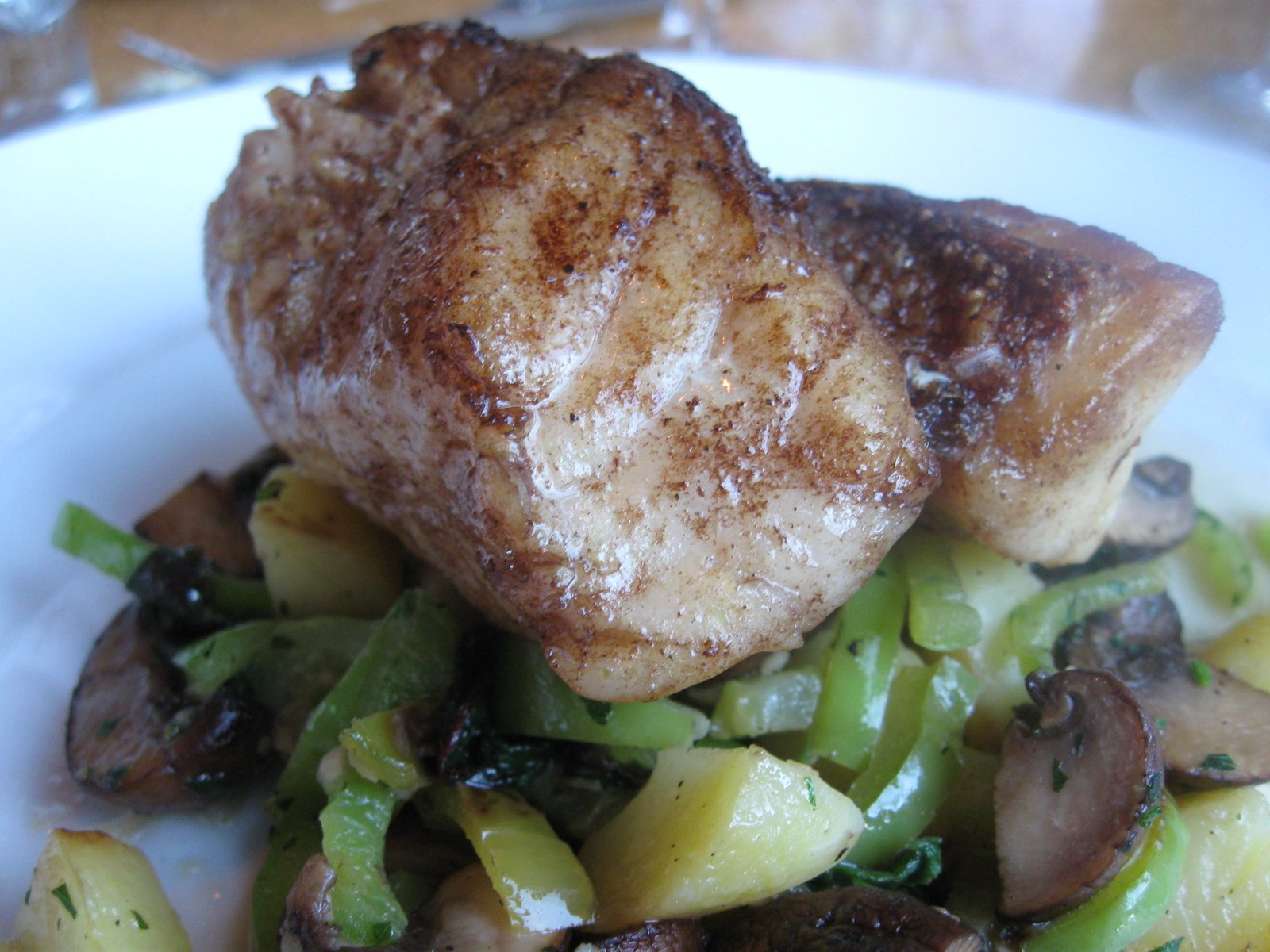 This was also perfectly cooked. The fish was moist and yet it flaked nicely. Notice that both fishes were perched on the same pile of diced firm waxy potatoes, rainbow chard, mushrooms, and anaheim pepper strips. Underneath the veggies was a creamy and flavorful horseradish sauce. While I prefer restaurants that accompany their fish choices with different sides, flavorings that complement each type of fish perfectly, I had to agree with Tina that this particular vegetable/potato combination had a nice flavor and texture. Its simplicity was a good match to the lightly seasoned fish. Each of the various vegetables was cooked well. And a good variety of tastes and textures.