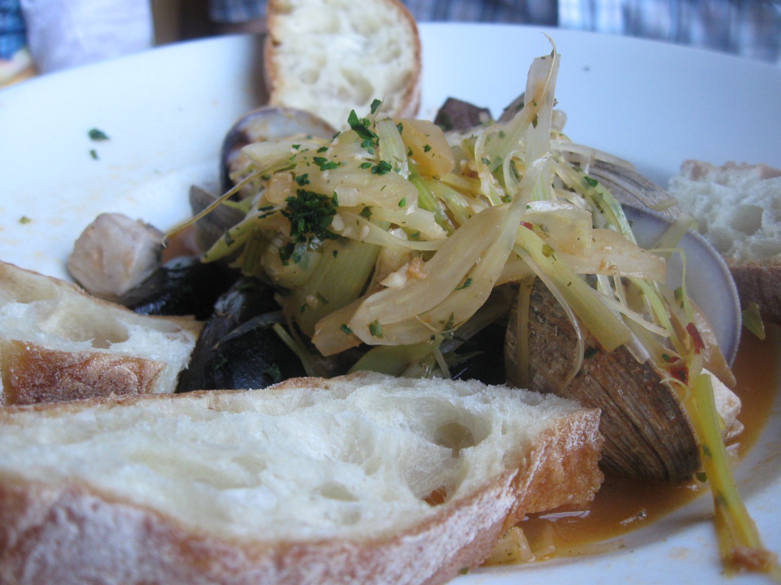 Steve had ordered the seafood stew ($18). When it first arrived, we all thought that he had received another appetizer plate of steamers. The same clams and mussels, the same slices of good bread, and the same shredded leek topping: