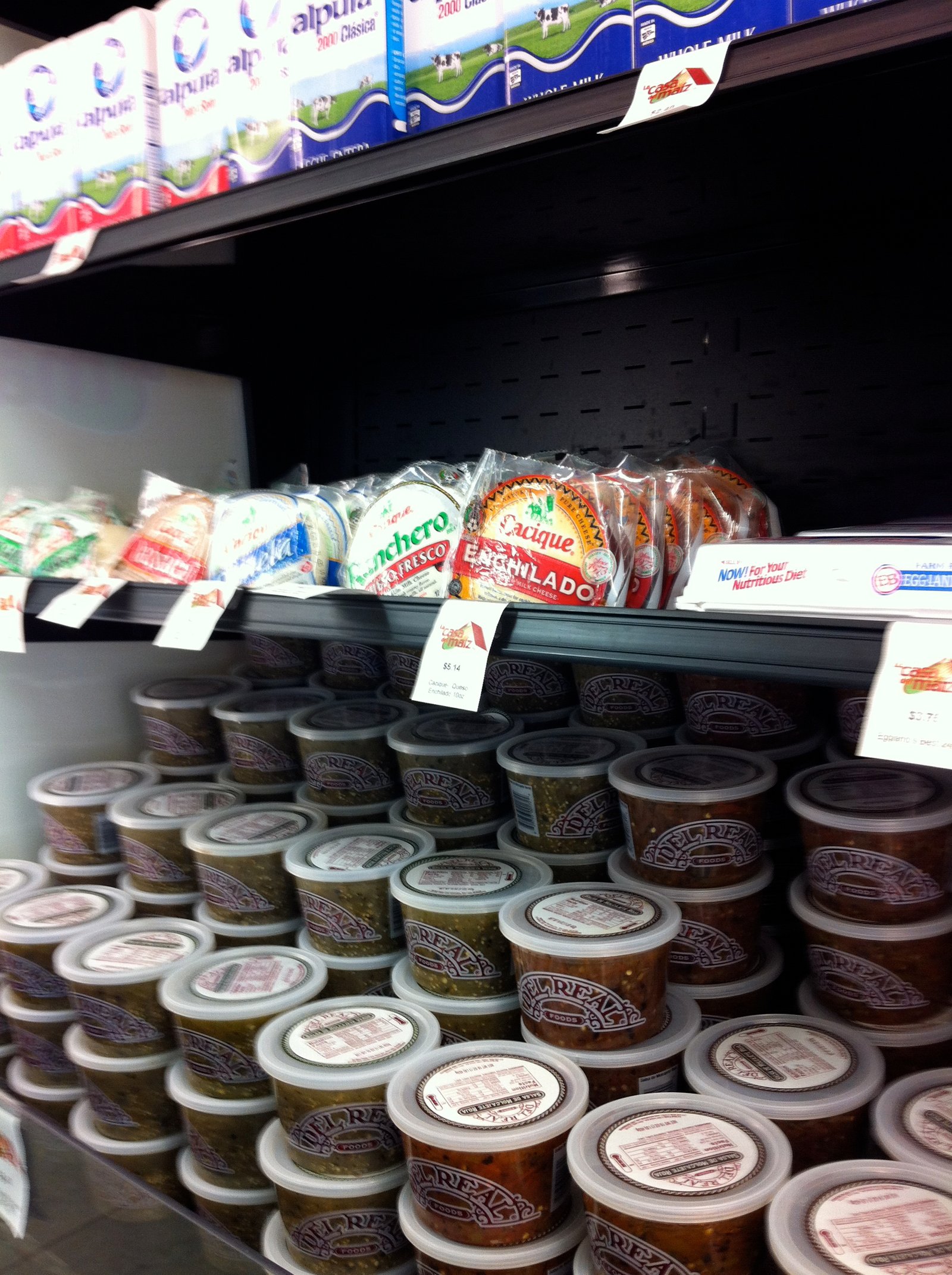 shelf stable milk, eggs, cheeses, salsas and a refrigerator of beverages, mostly Jarritos.
