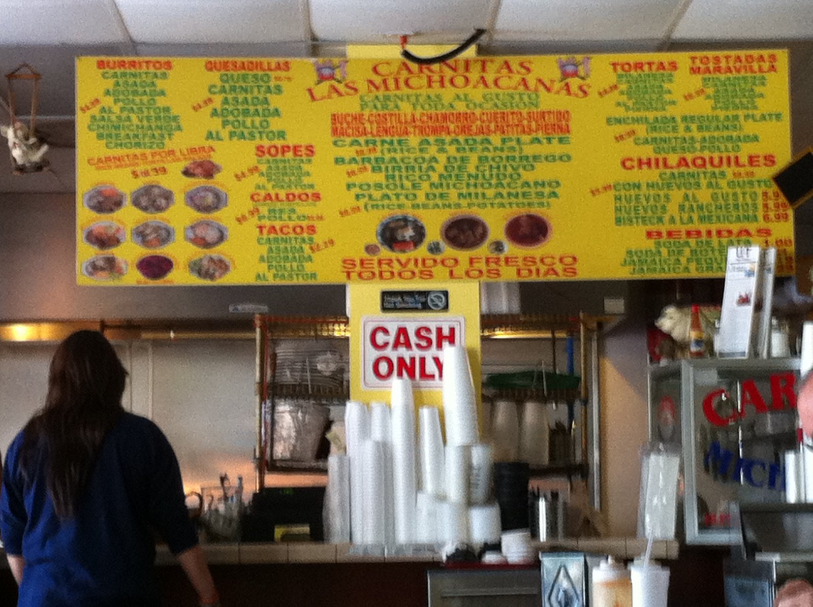 Walk in and that's the menu: Burritos, carnitas by the pound, quesedillas, sopes, soups, tacos, plates, posole, tortas, tostadas maravilla and chilaquiles. The by the pound carnitas are not at all the only meat here, although (so far) I like it very much.