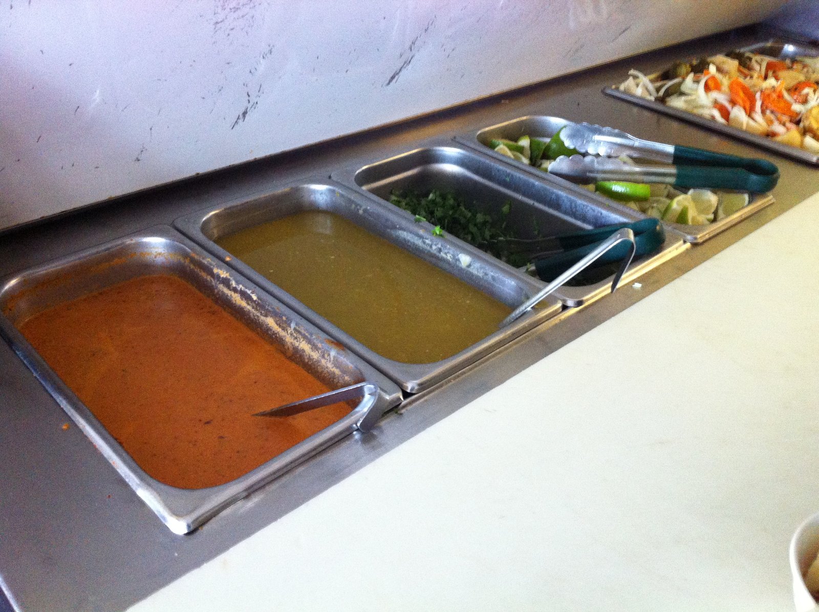 As well as a salsa bar at the front, if you are buying something 'to go'. As an aside, the green hot sauce tastes green-and is hot/spicy. The orange hot sauce is very pleasant and has a mild, if any, heat.