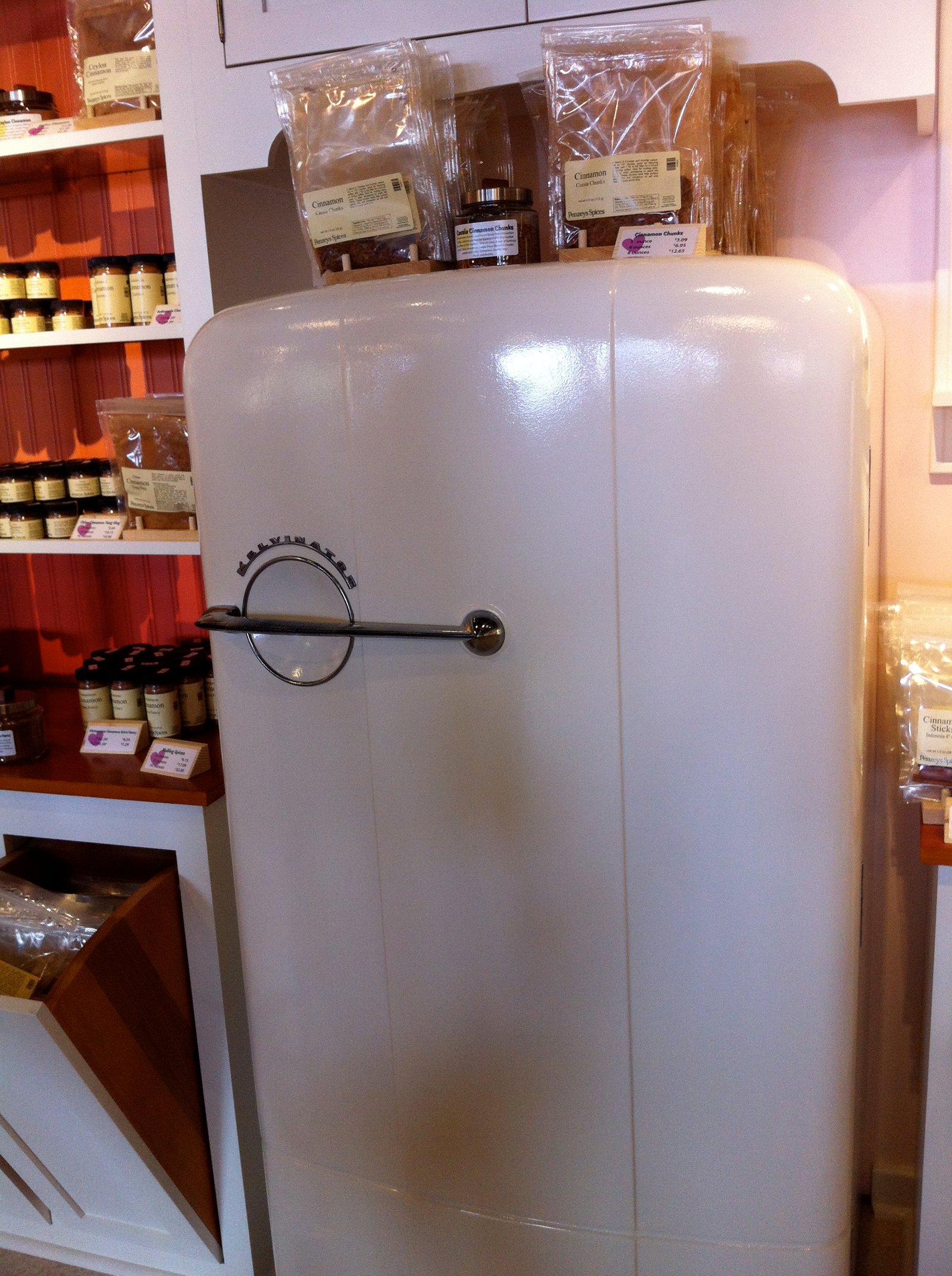 The display area inside is mostly stacked wooden crates and even this kitchen vignette (I grew up with a Kelvinator refrigerator just like this one; a common sight in Detroit). See the larger jar in the middle on top of that fridge? That's a sample jar. There is one with just about every product in the store- you can smell the herbs, spices, whole chilis and blends (there are even glass bottles with the liquid extracts for you to sniff). It was like reading the catalog but live!