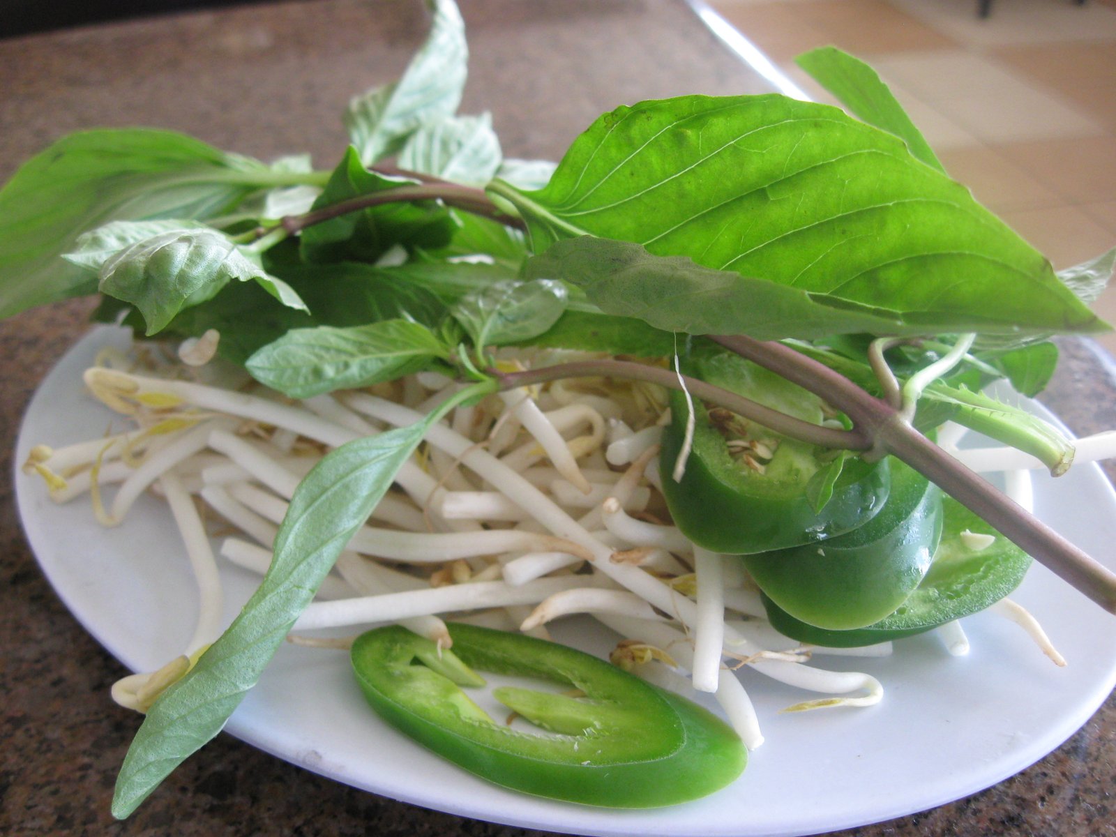 Look at that wonderful abundant fresh basil. Perfect. Notice the sawtooth leaf underneath it. Four thick slices of jalapeño and perfectly fresh bean sprouts.