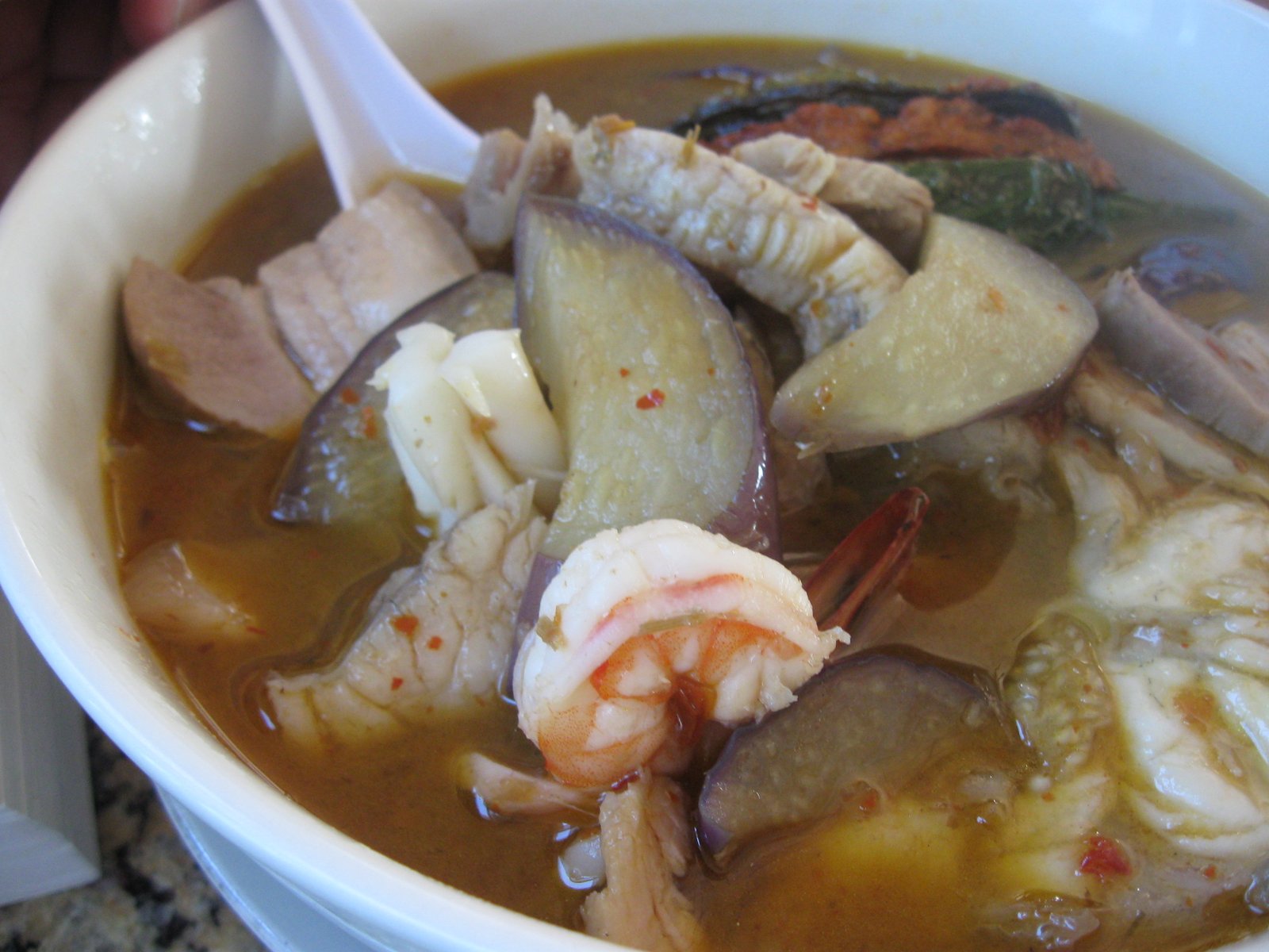Here you can see the chunks of eggplant (cooked soft and buttery), decent sized shrimp (a little overcooked), a one of the few pieces of squid (pleasantly tender), and some of the pork belly: