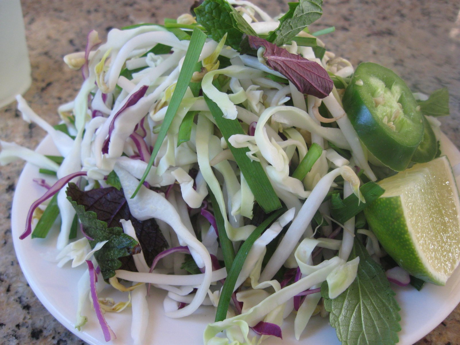 Notice that everything is mixed up together – as if the restaurant is saying, we know the right proportions of mint leaf, shredded red cabbage, shredded regular cabbage, beans sprouts, lime juice, and fresh jalapenos. I honestly don't know what the long green grass like leaves are, but they went into the soup anyway.
