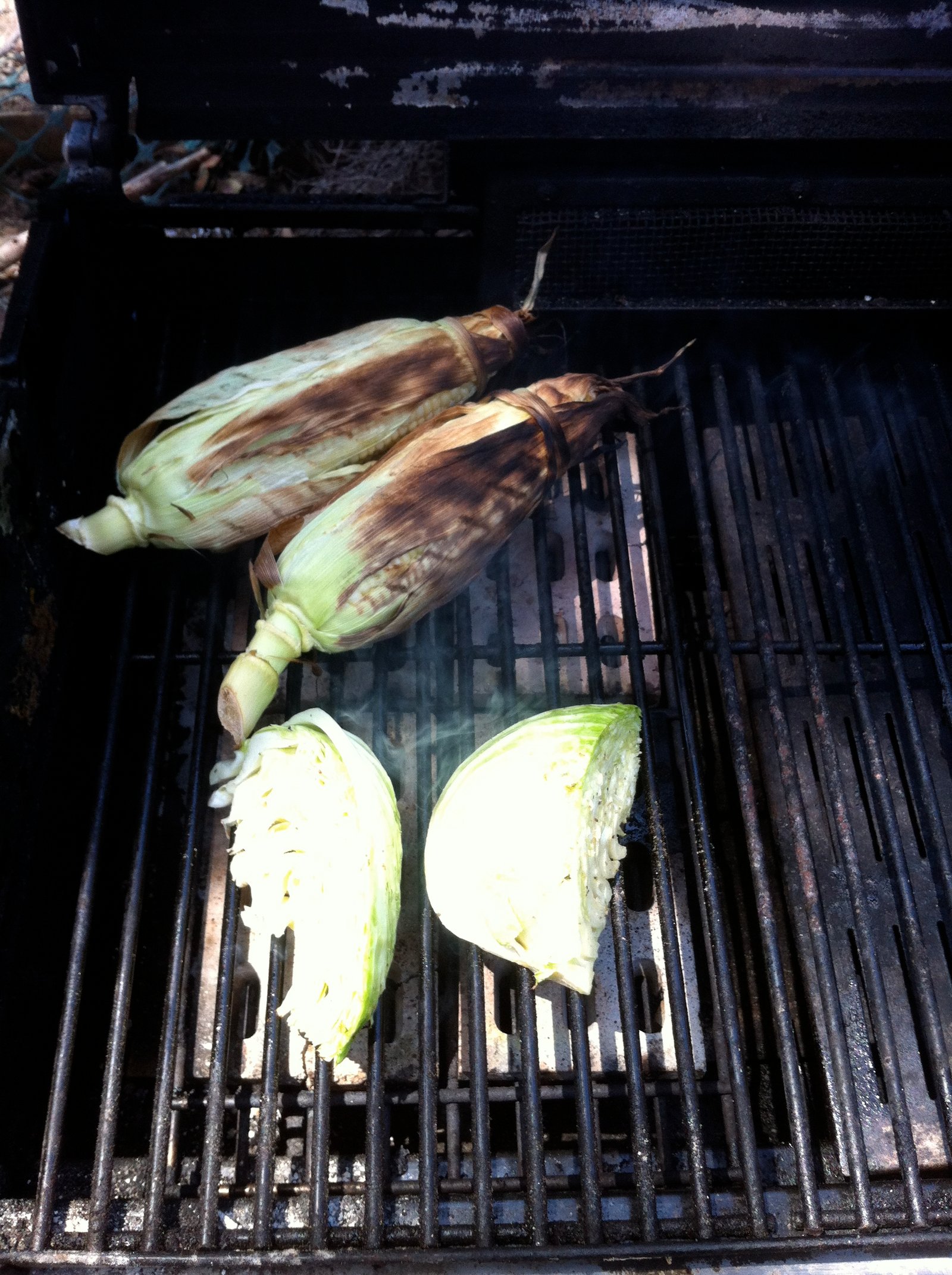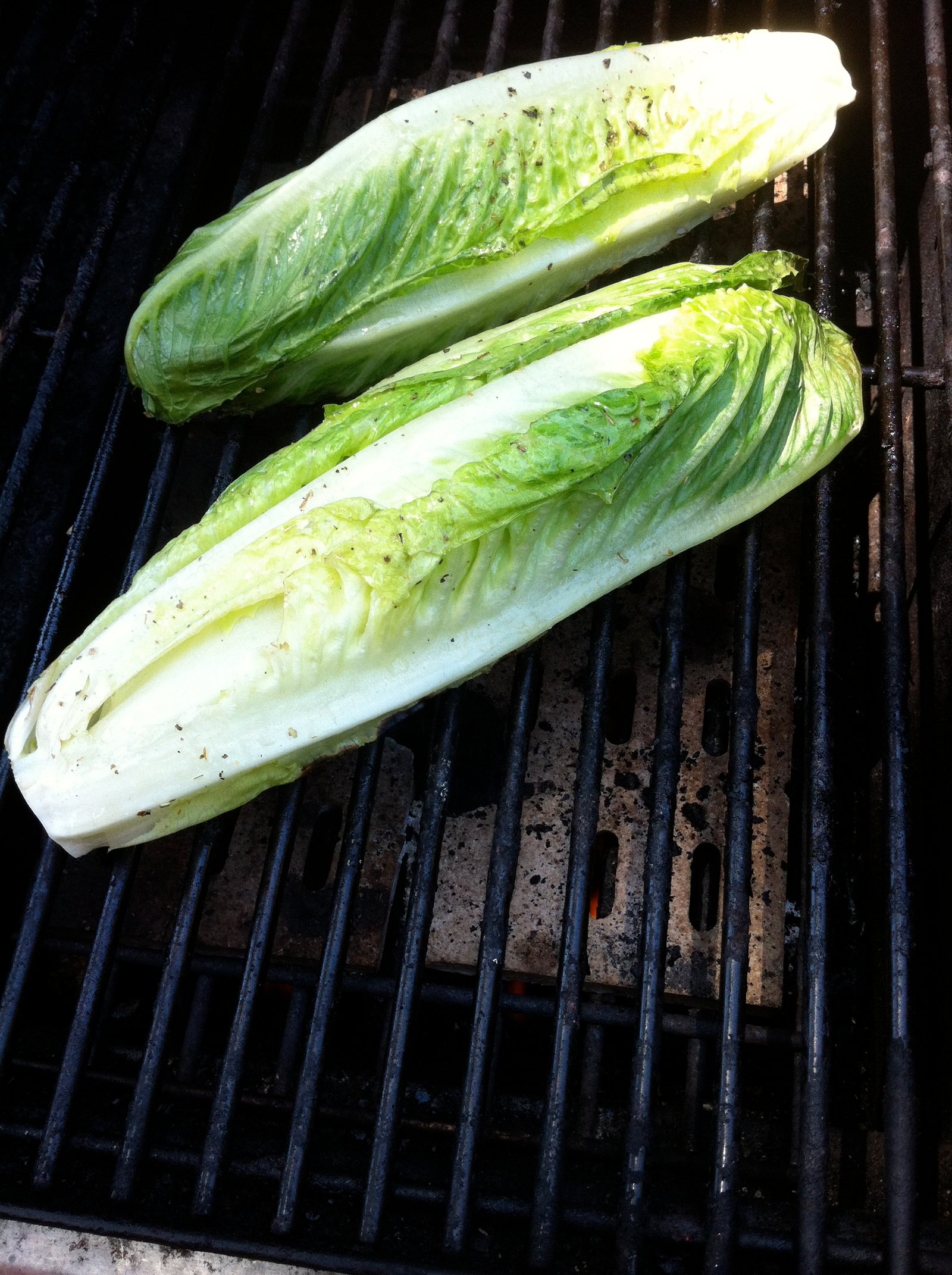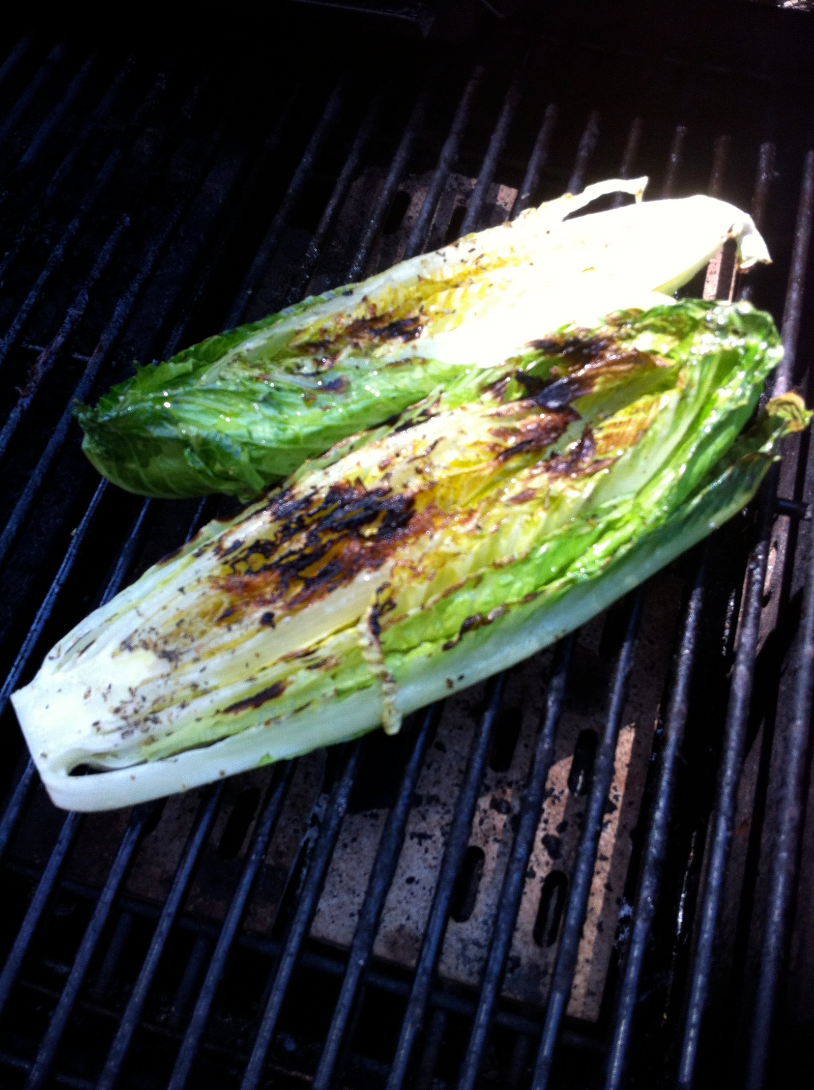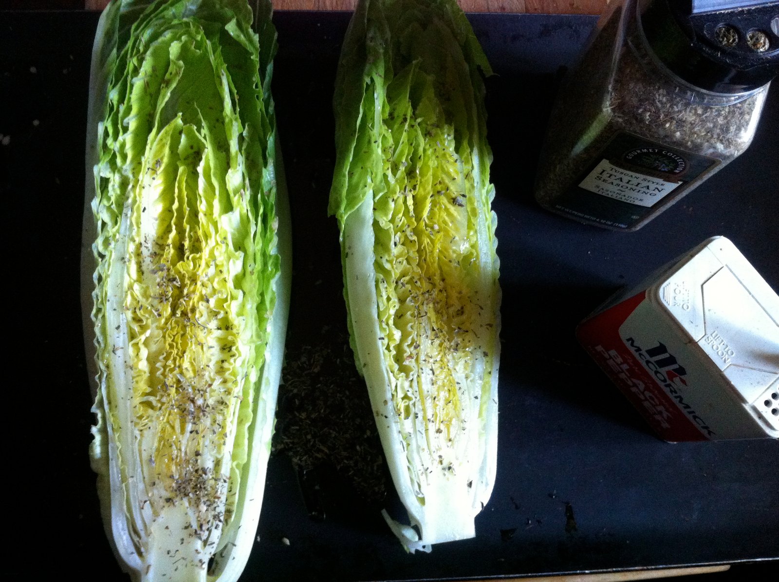 This is a new flavor point for me. Grilled lettuce. Cut a head of Romaine in half, brush with olive oil and sprinkle on salt and pepper (I have also done this with Italian seasoning and also salad dressing and both work, but I think each has almost too many spices for my palate).