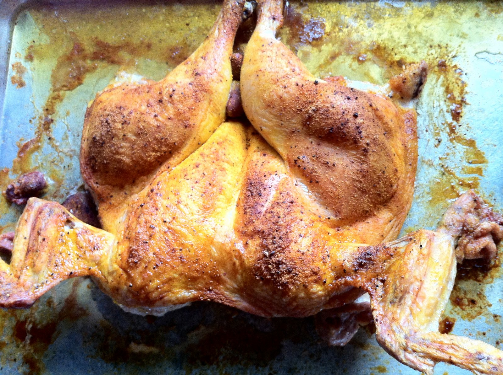 This photo is a spatchcocked chicken that was placed onto an edged/jelly roll sheet pan and sprinkled with some seasoning and placed on the other/unheated side of our gas grill, using the grill like an oven. The chicken, and all fowl, cook faster using this cutting technique. This chicken was done in less than 30 minutes.