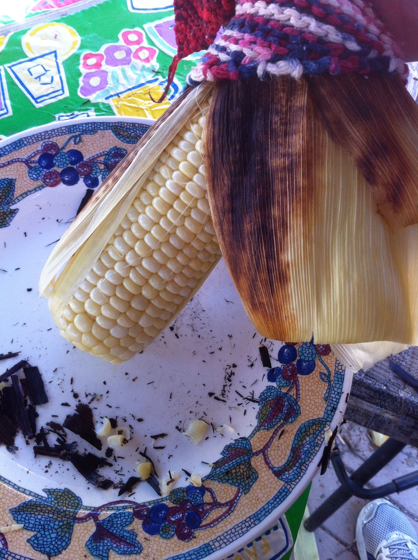 If you put 'cleaned' corn onto the medium heated grill, brush with a bit of olive oil first then roast it until it is lightly charred (I do this with 'older' corn) it cooks in about ten minutes.