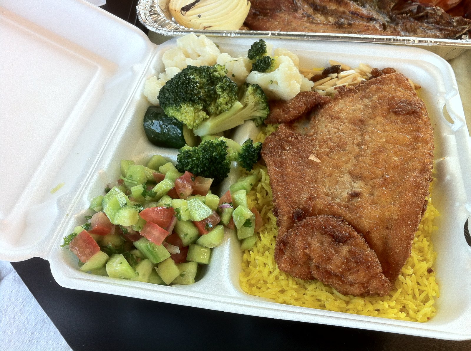 Another day, we chose the fried fish filet meal (also $7.99). This was tilapia, lightly breaded with corn meal and place on saffron rice. This came with the Iraq salad- chopped cucumber and tomatoes in a simple olive oil and lemon dressing and steamed vegetables. The squeeze bottles of pink liquid on the tables, the only condiment other than salt and pepper, is red wine vinegar. I use that with the vegetables as well as the rice after eating about half of it 'plain'.