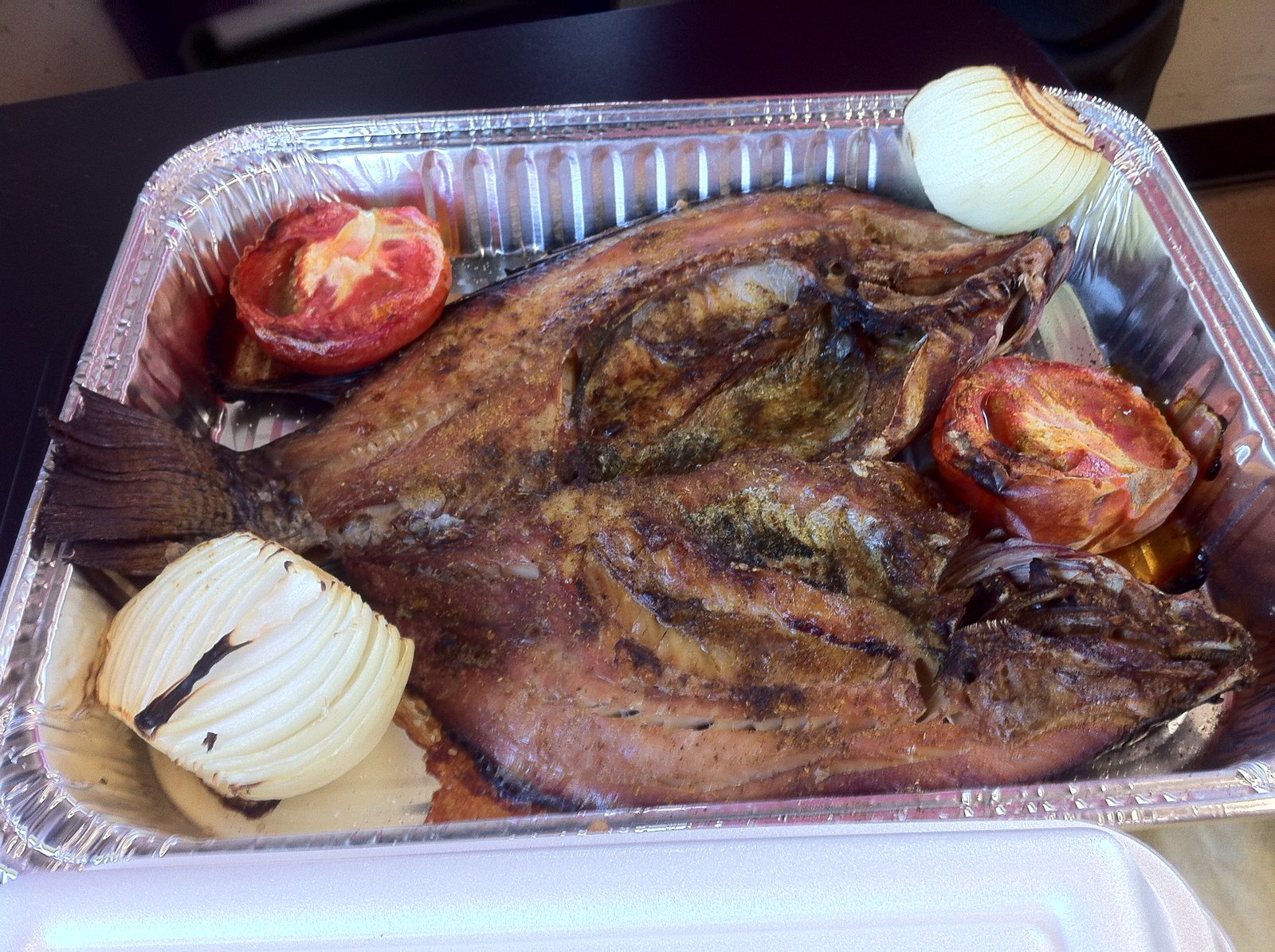 The masgoof-prepared whole tilapia ($6.99) is in the steam table just like this and this is what you get. The whole fish, split and grilled with a whole onion and a whole tomato, also grilled. Usually one of us goes into the store and buys a piece of bread to go with this filling, simple meal.
