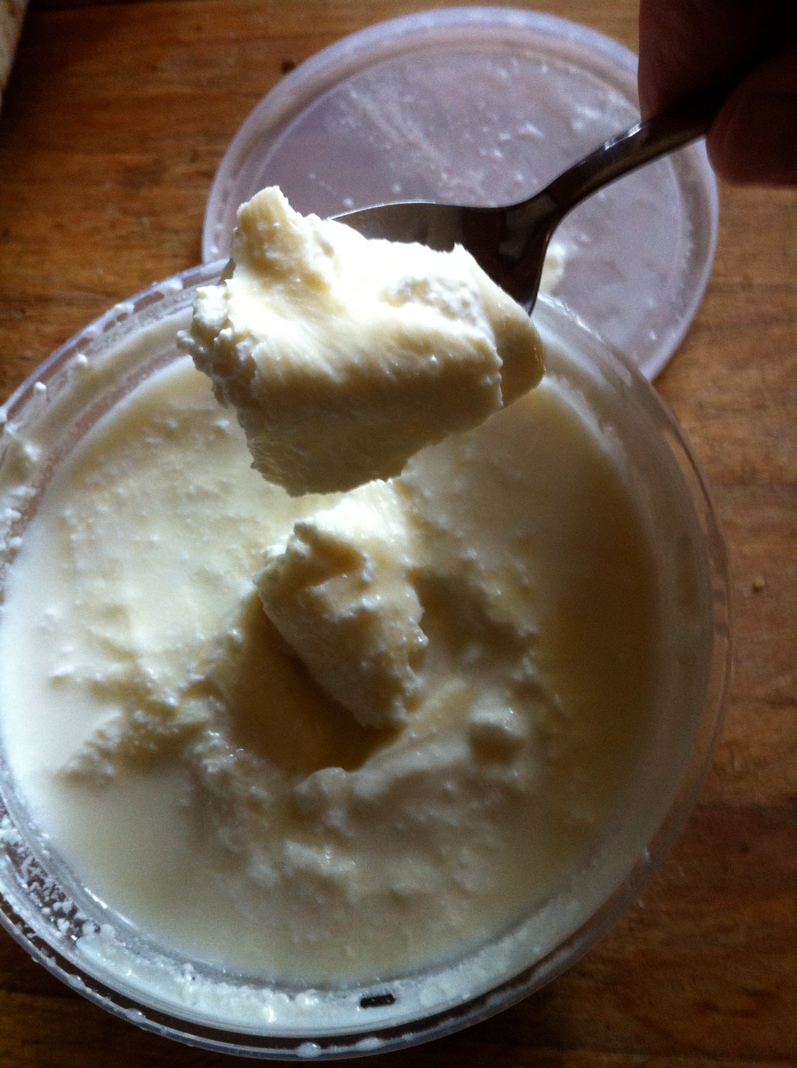 Then there is the texture. You can see the 'skin' that was formed on top of this first scoop taken from the container. The yogurt is thick but not smooth. I always buy a container when here. The price is about $2.59/pound; worth it.