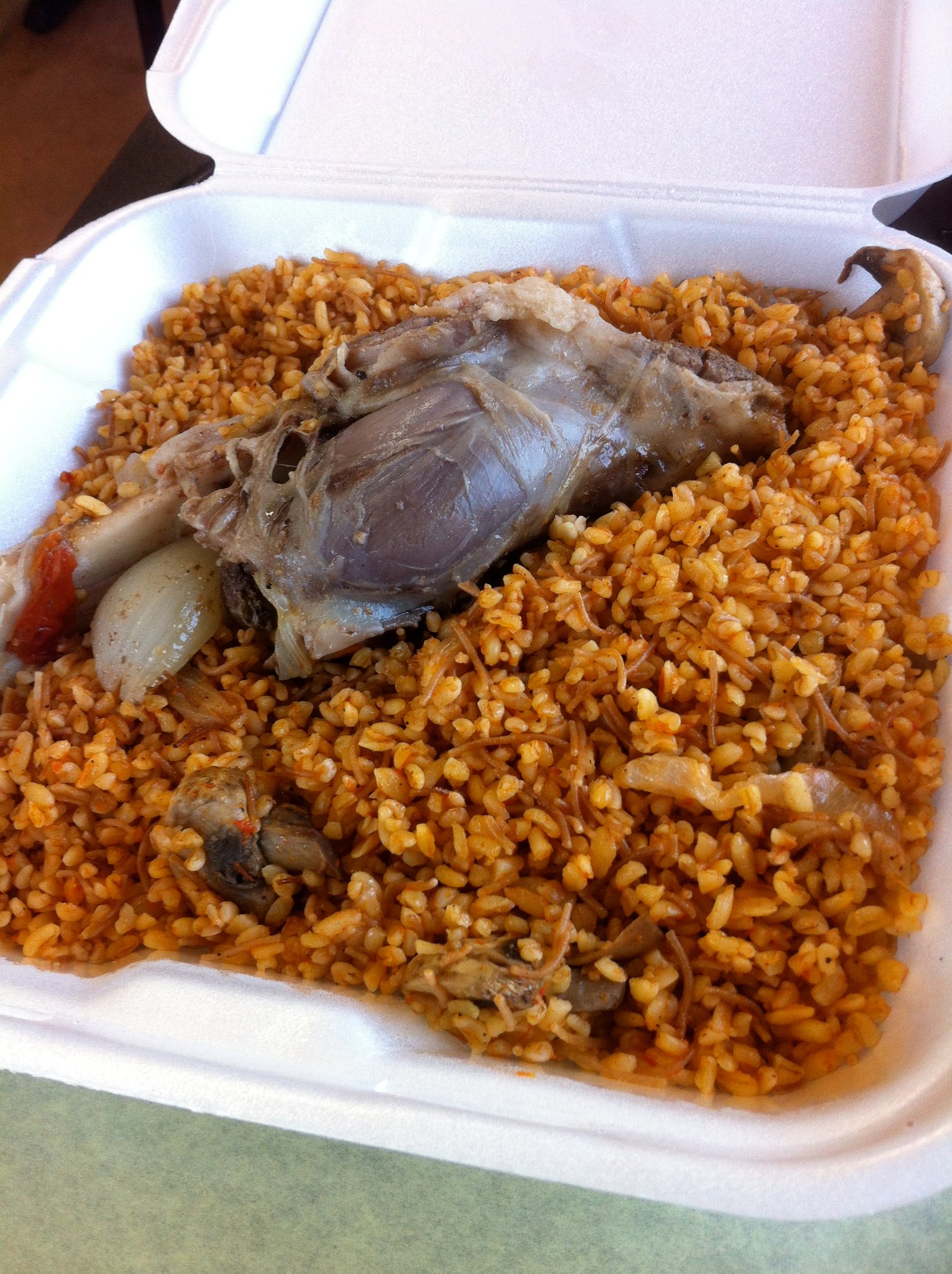 One day, we tried the lamb shank meal ($7.99) We were asked which rice we wanted to go with the shank and chose this one, which had bulgur and vermicelli. Then the nice lady put some scoops of a tomato and onion sauce on the grain mix before putting the large and moist lamb shank on top of it all.