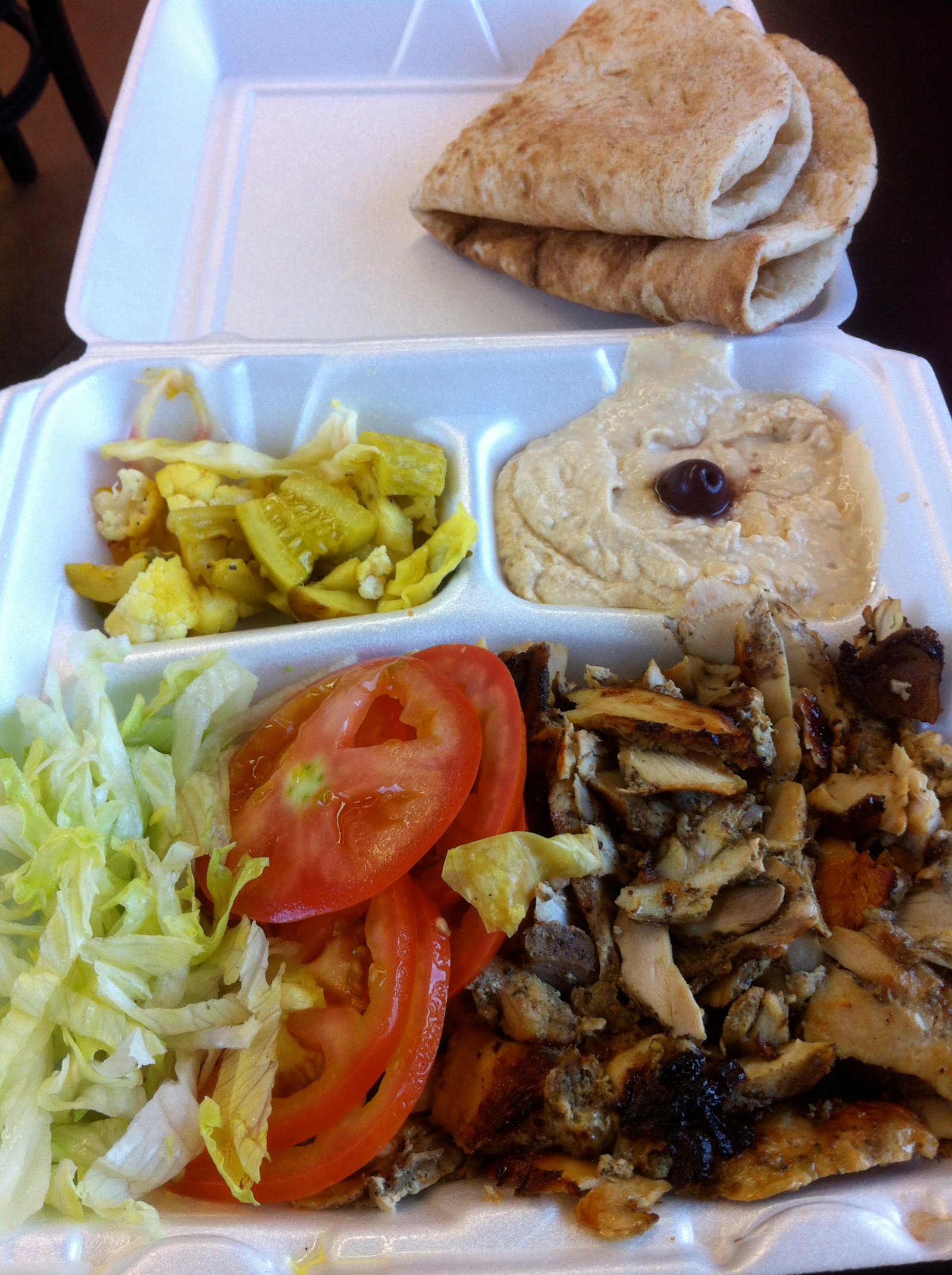 The chicken schawarma plate ($7.95). I mentioned in one of my other posts about the spits in the back cooking schawarma. This is an easy way to get more than a sandwich. The moist, grilled meat is a hefty portion and comes with lettuce, tomato, house made pickles and house made hummus and a small, hot piece of flat bread, which is made in the store.