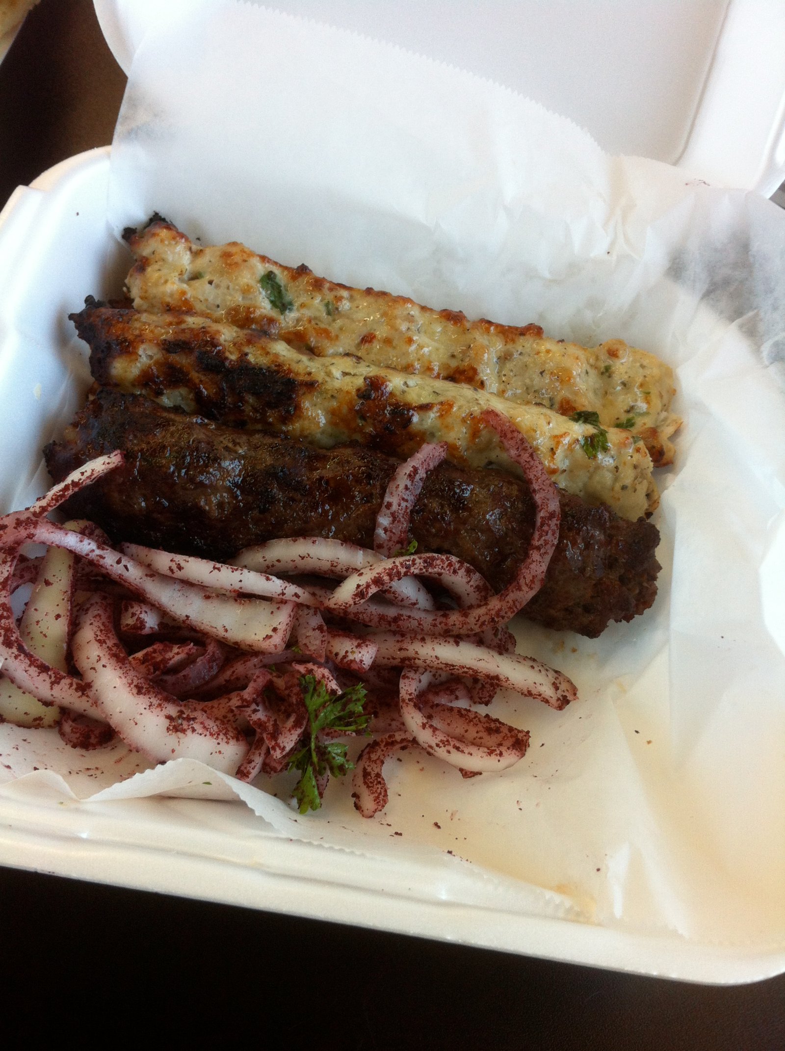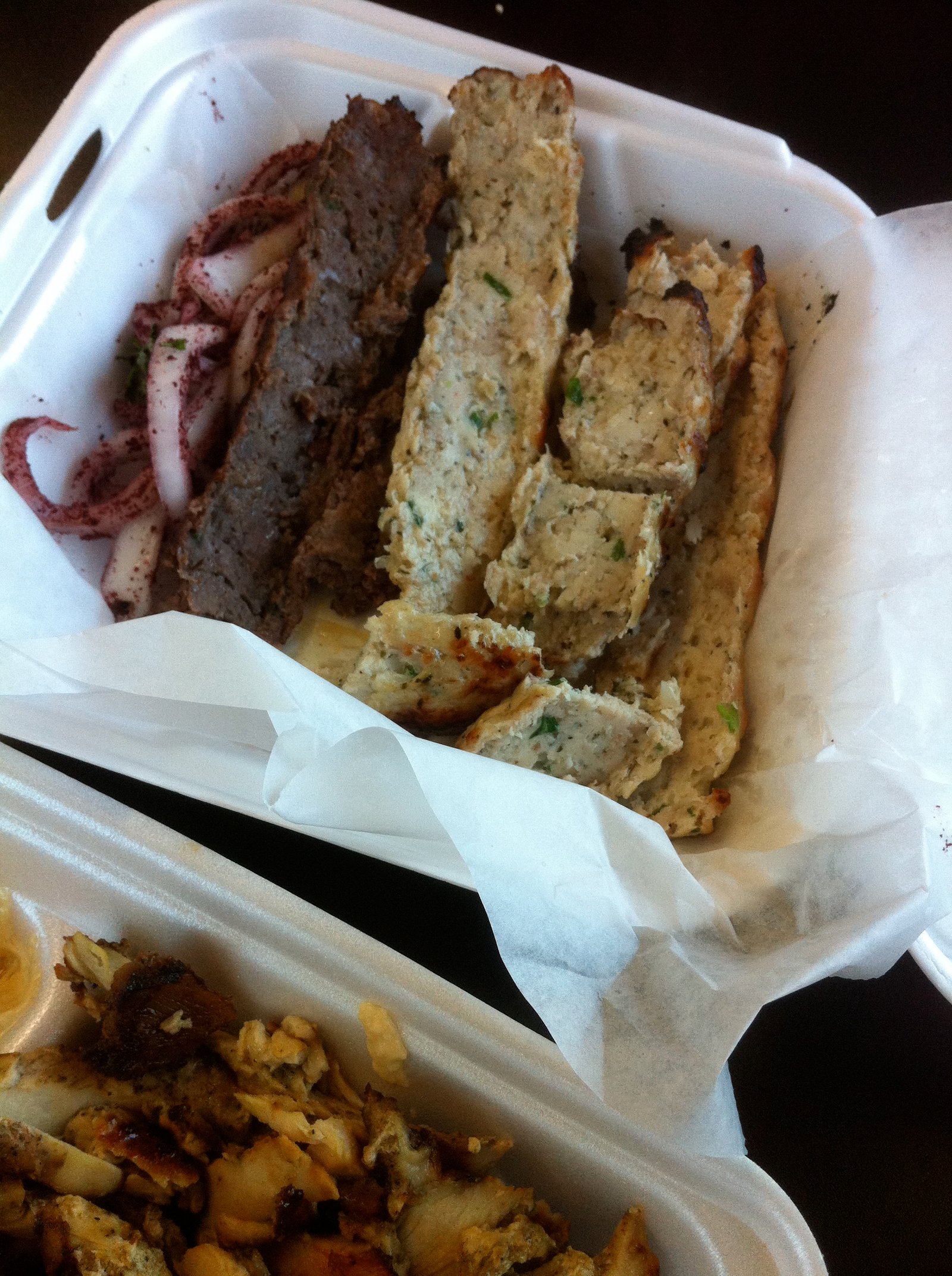 Here is a cross section photo of the kabobs. You can see some of the herbs which are mixed with the ground meats before grilling. I really like the kabobs here, not only moist, but so flavorful- and large. If we order five, we end up taking two home for dinner.