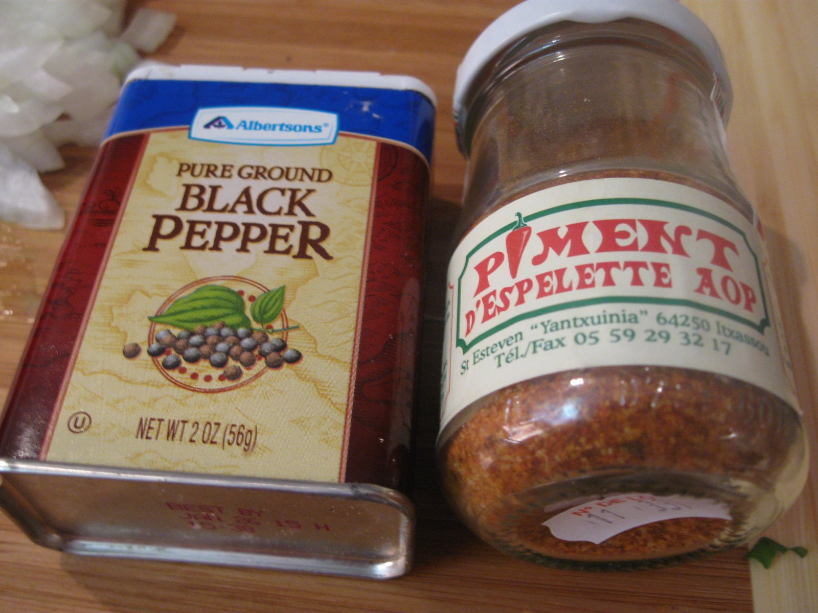 I also added a half teaspoon (or so) of black pepper and at least as much red pepper. Sometimes I have used Korean crushed red chilies, sometimes Italian style hot pepper flakes, but Tina's friend Krystal had sent us some excellent spicy and flavorful Basque ground red peppers, which added a nice zing to the dish: