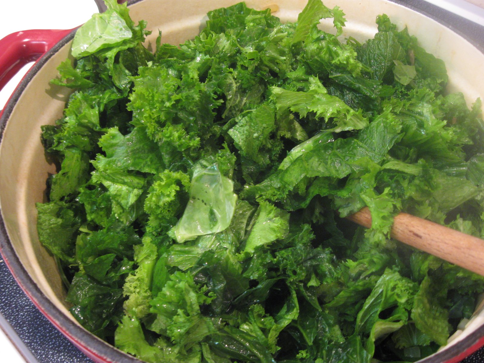 After I stirred them quickly, I dumped in the mustard greens: