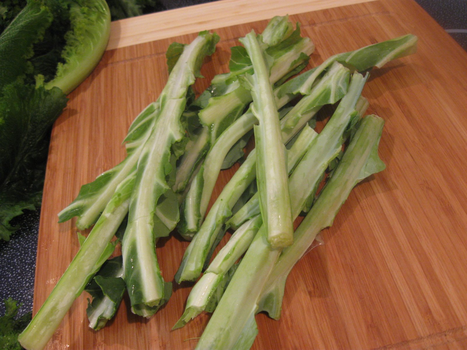 Then I remove all of the large central stems. I know some people leave them in, but the stems have little flavor and cook at a different rate: