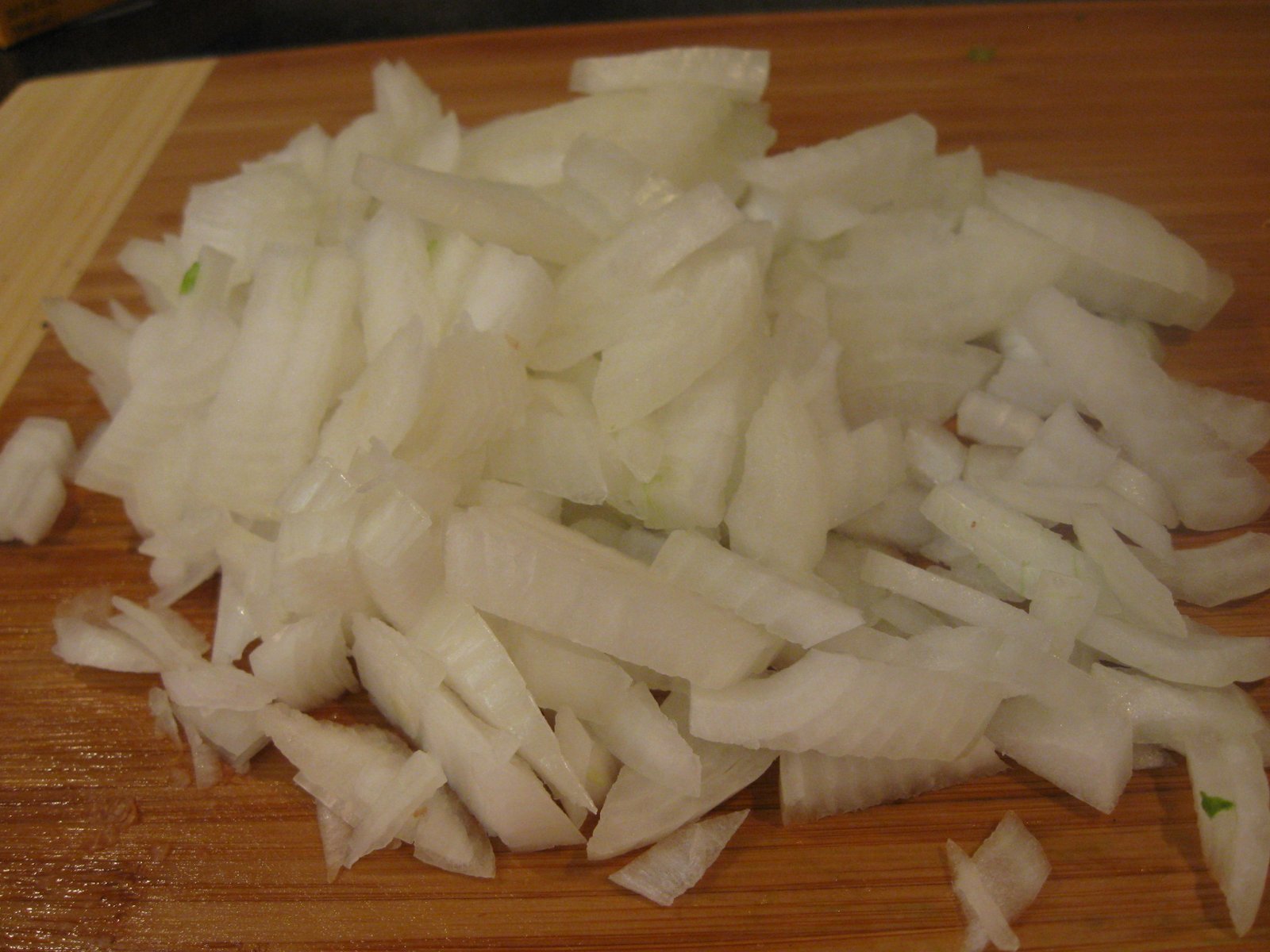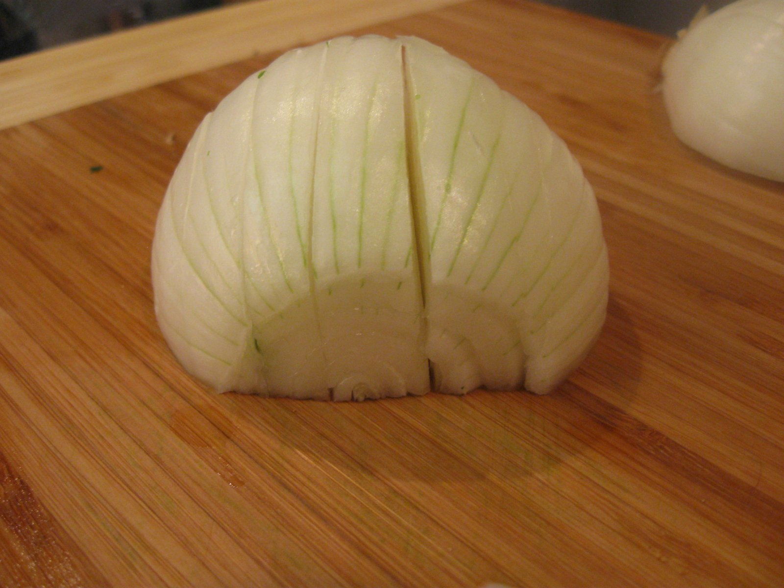 The other ingredients are even easier to prepare. I cut an onion in half, peel it, lay it down on the cut sides, and slice it lengthwise: