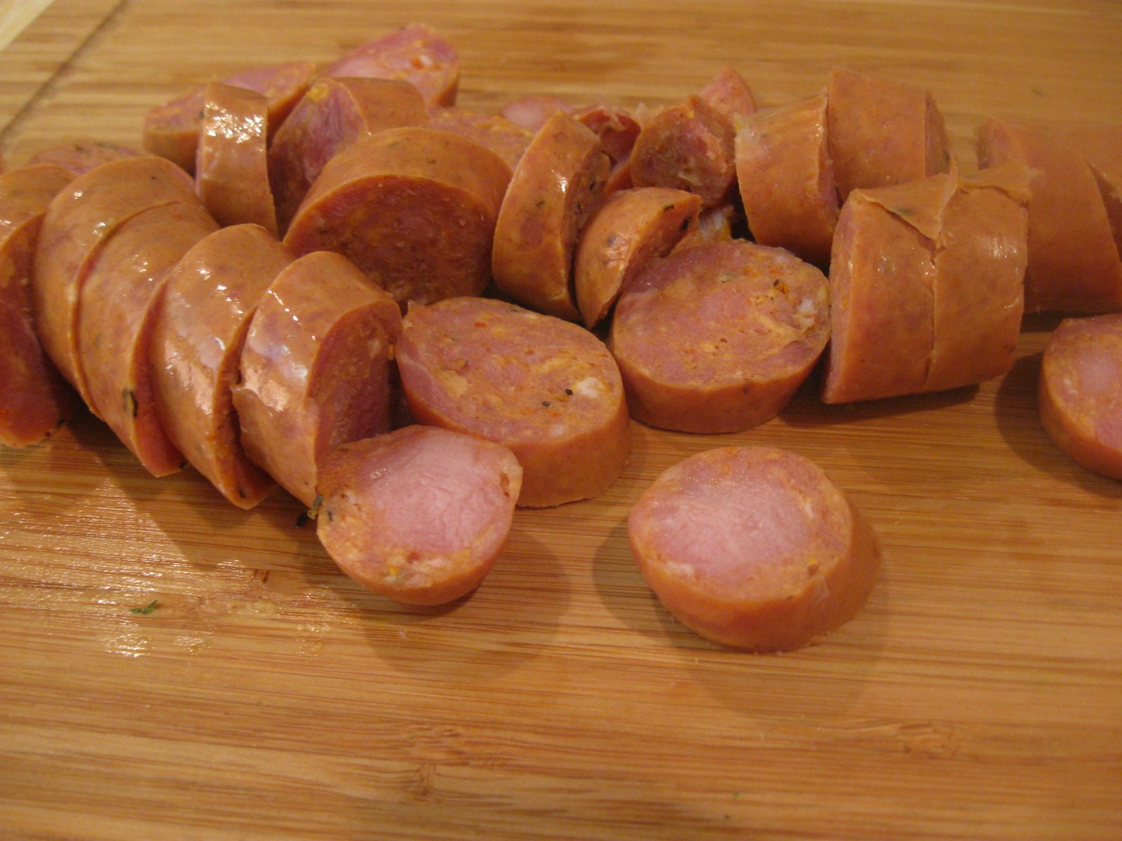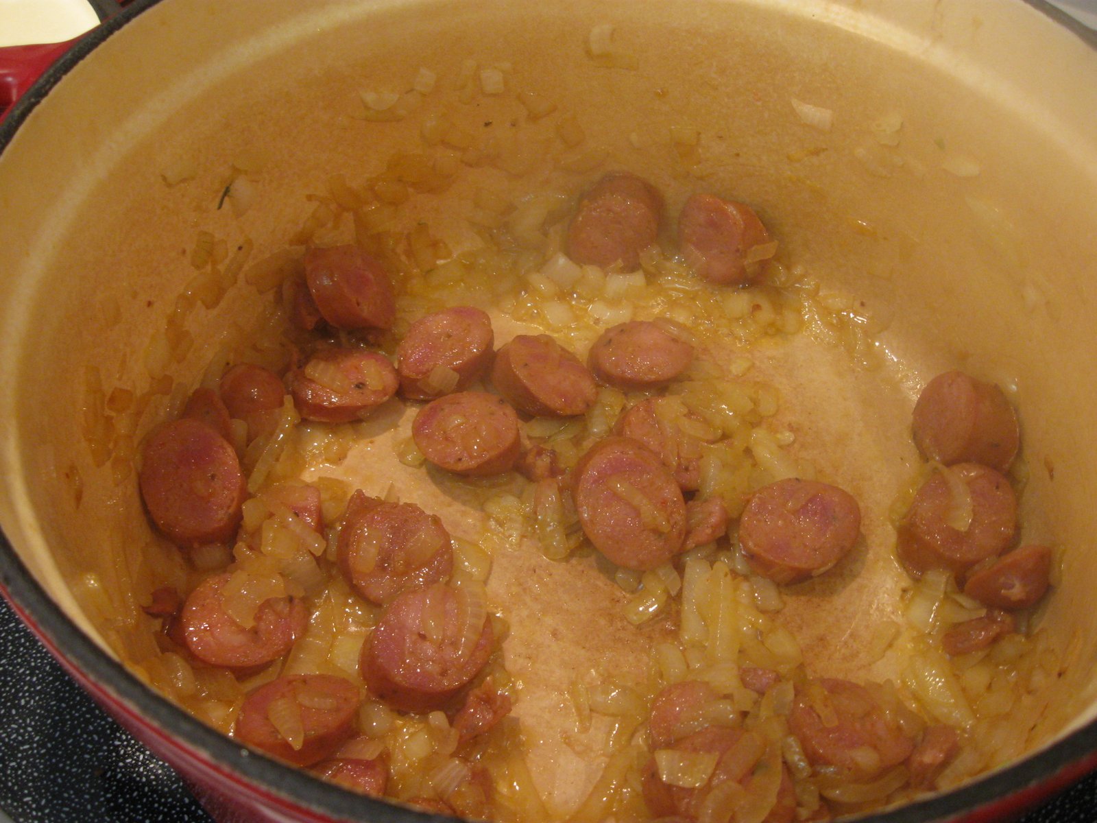 After they were softened and turning translucent, I added the sliced Andouille sausage and just cooked long enough to warm the sausage slices: