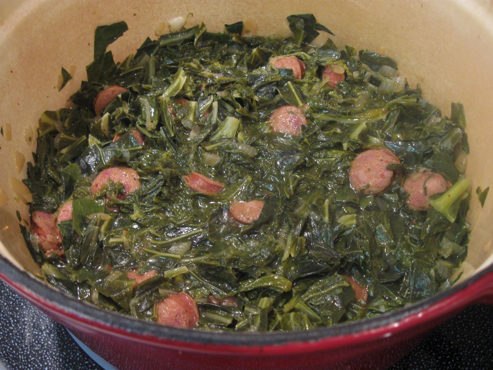 This sausage adds complex spicy notes to the smoked meat flavors. I think of it as Looozanna style greens when fixed this way. This particular evening, I sliced up three links to put in the pot: