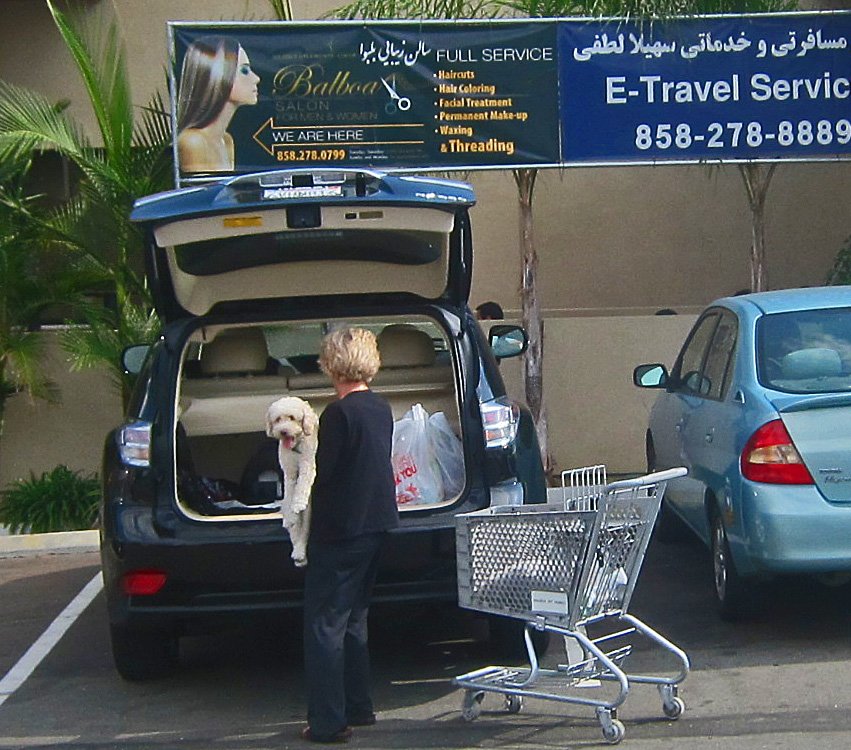 Saw this woman treating her fairly good sized pooch like a baby in the parking lot of Balboa Market…loading in groceries by hand while carrying the dog with the other.