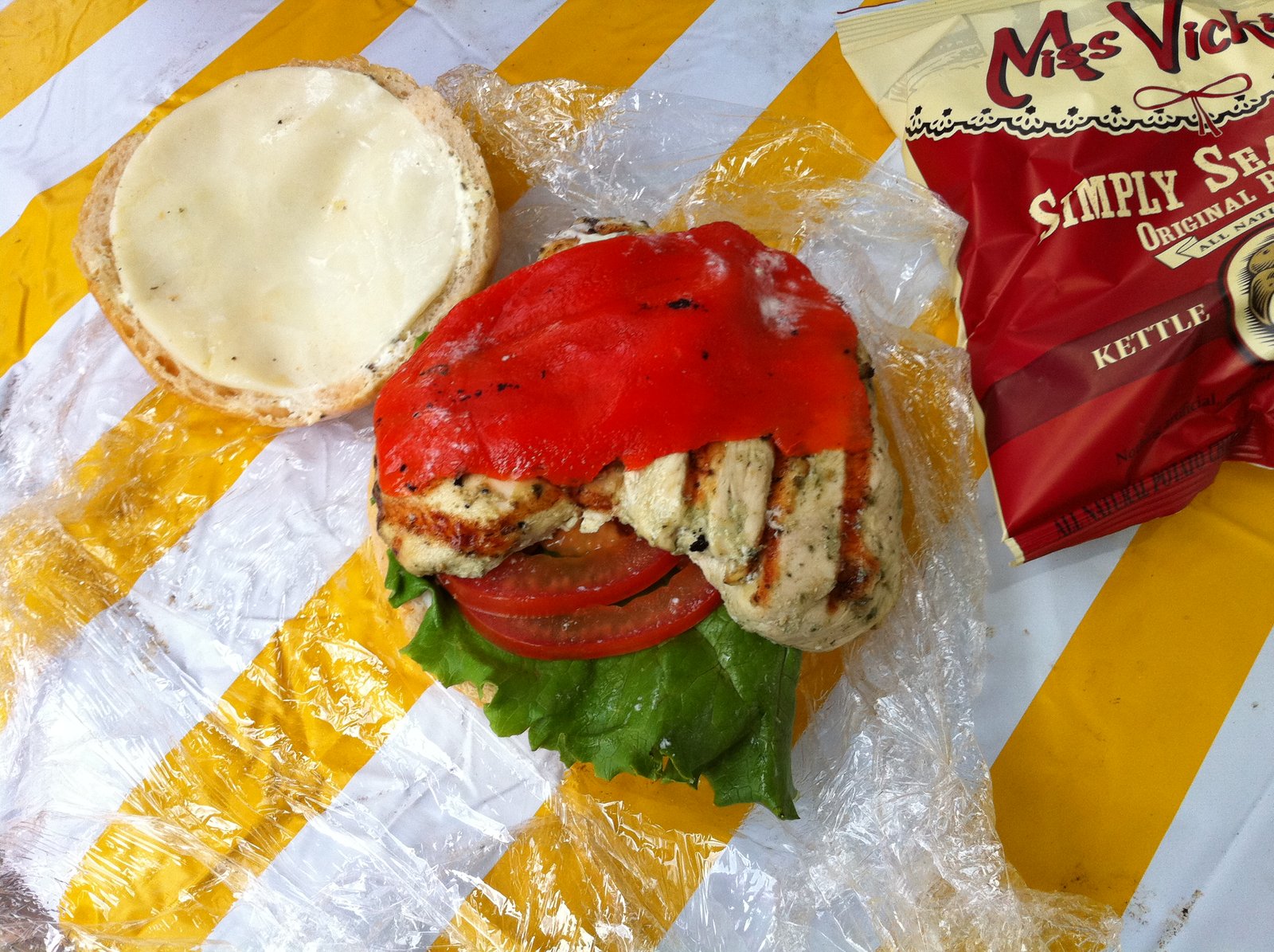 This was the most surprising, delicious flavor combination and sandwich I have had in a very long time.  Not only was the chicken a full grilled breast half, served with lettuce, tomato and a mild cheese along with the pesto, but a grilled red pepper completed the flavor points. I learned to roast peppers over an open flame at home, pop the peppers into a plastic bag to steam and easily peel off that skin and have peppers available in the fridge to satisfy cravings and use on sandwiches made at home.