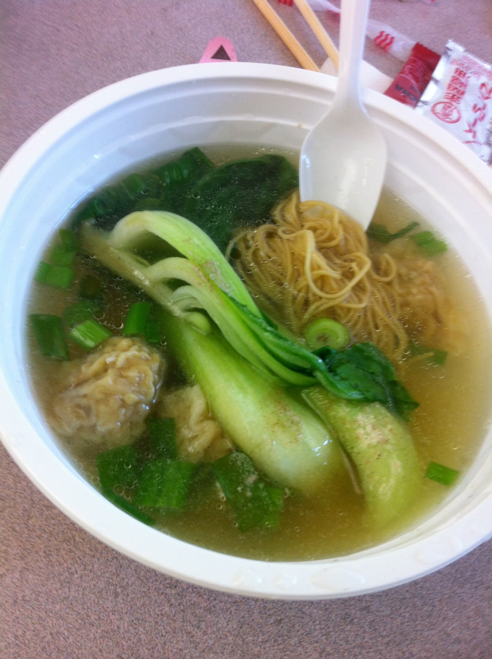 One day the soup was on special for $2.99. It had five shrimp and pork dumplings along with the noodles and bok choy, all cooked after you had paid and presented your reciept. It was very good. I hope the nice Soup Lady area returns; it was sad to not see her the other day.