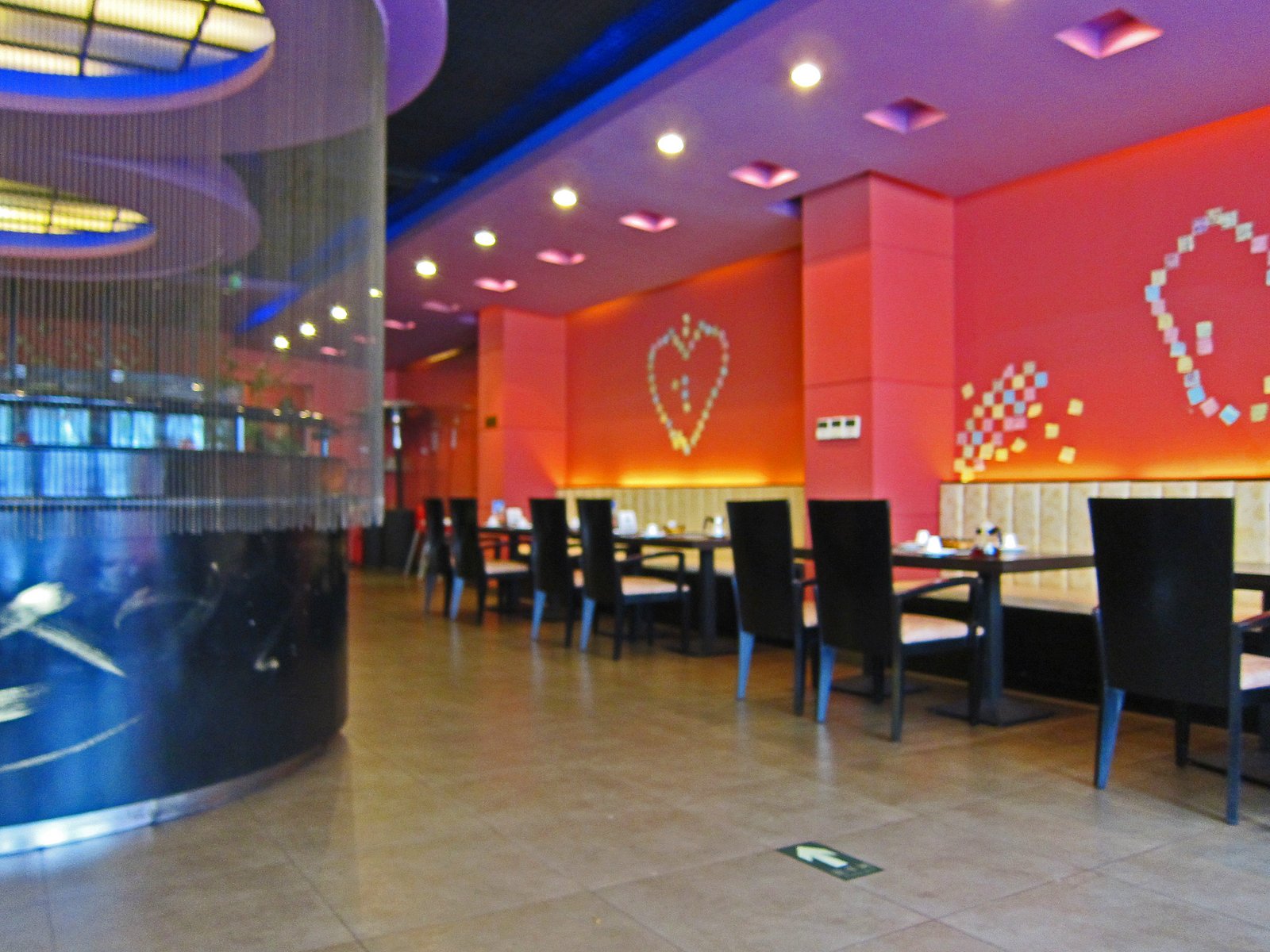 The interior of the restaurant was very modern and the patterns on the wall were made of post-it notes which had been filled out or signed.