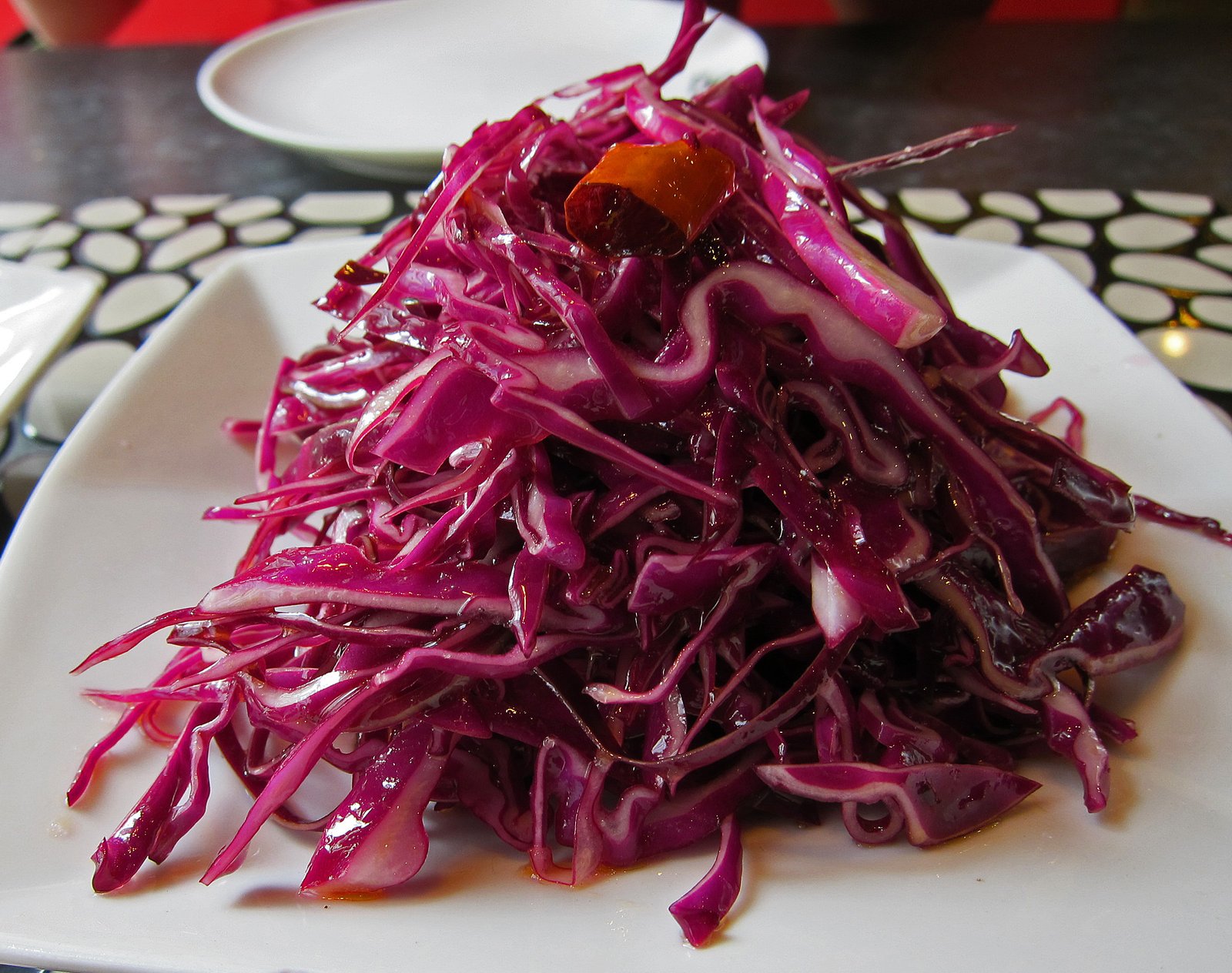We started with what was called stir-fried purple cabbage, but was more of a purple cabbage slaw, like the Missus' relatives in Jinan made and what I make at home.