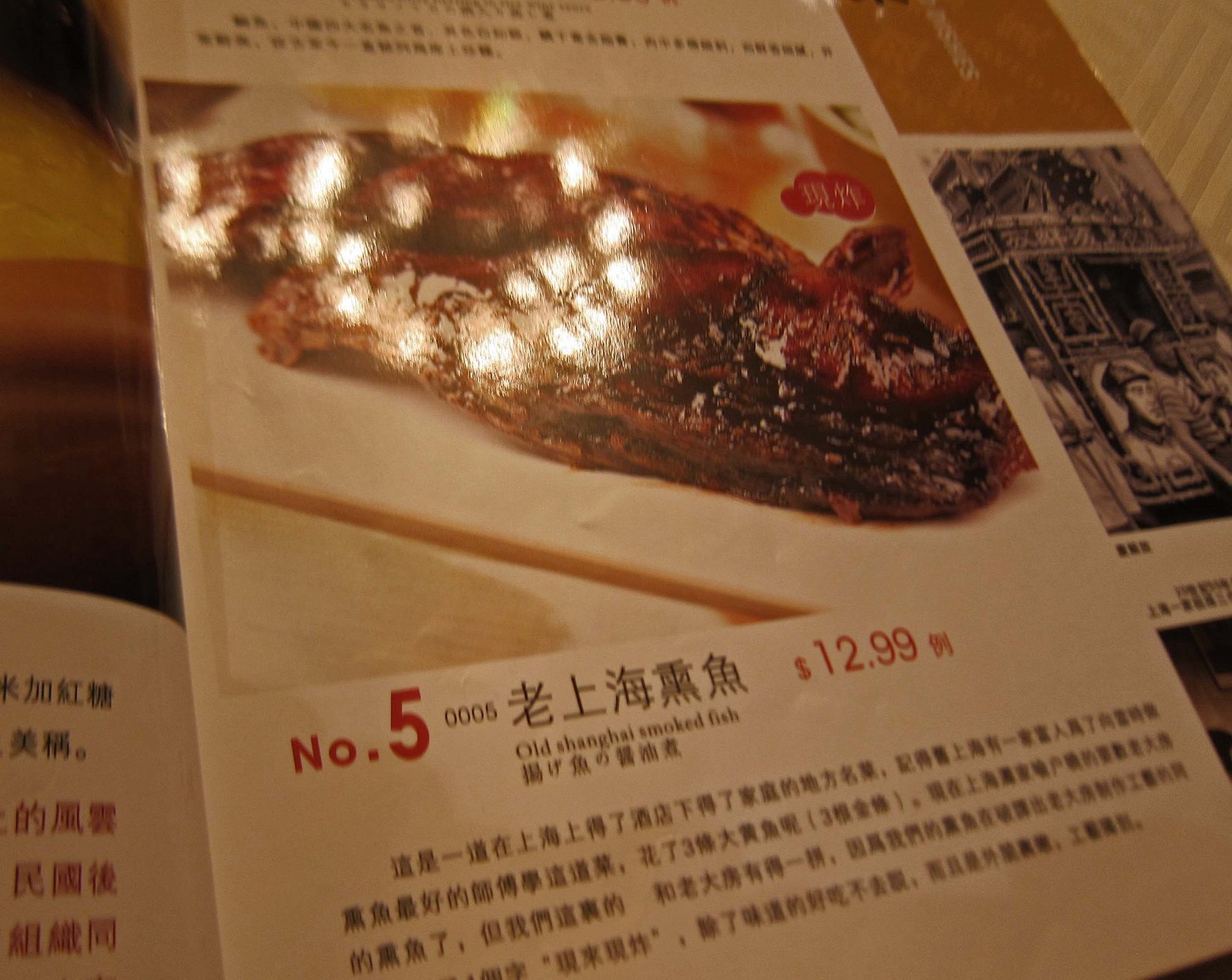So far so good…..but from here our meal kinda took a turn in the wrong direction. If you've read our little blog long enough, you know that we just couldn't have a Hu Cai (滬菜) meal without trying the Xun Yu. Here's it's called Old Shanghai Smoked Fish and this one is priced fairly high at $12.99. Supposedly this is not made in the traditional way, but cooked to order, which, if you've ever made this – marinated-deep fried-marinated, seems a bit odd. The dish, which was on the small side was presented well.