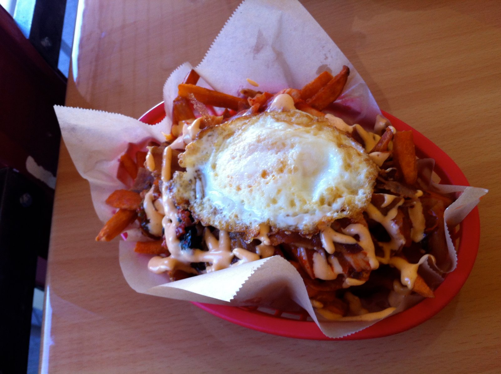 Then there were Sides available. Not only fries and sweet potato fries, but onion rings, tots, potato salad, slaws, chili cheese bowl, small tossed salad…but 1/2 skin on fries 1/2 sweet potato fries as well as chili cheese fries, truffle fries, parmesan fries, garlic fries or, our choice…Kimchi sweet potato fries ($5.99) (yes, more than the Slaw Dog). Sweet potato fries, perfectly nicely fried and topped with spicy sesame aioli (the 'spice' may have been Sriracha)bacon pieces (large, real bacon pieces), fresh made kimchi (not too spicy; a great version) and an over easy fried egg.