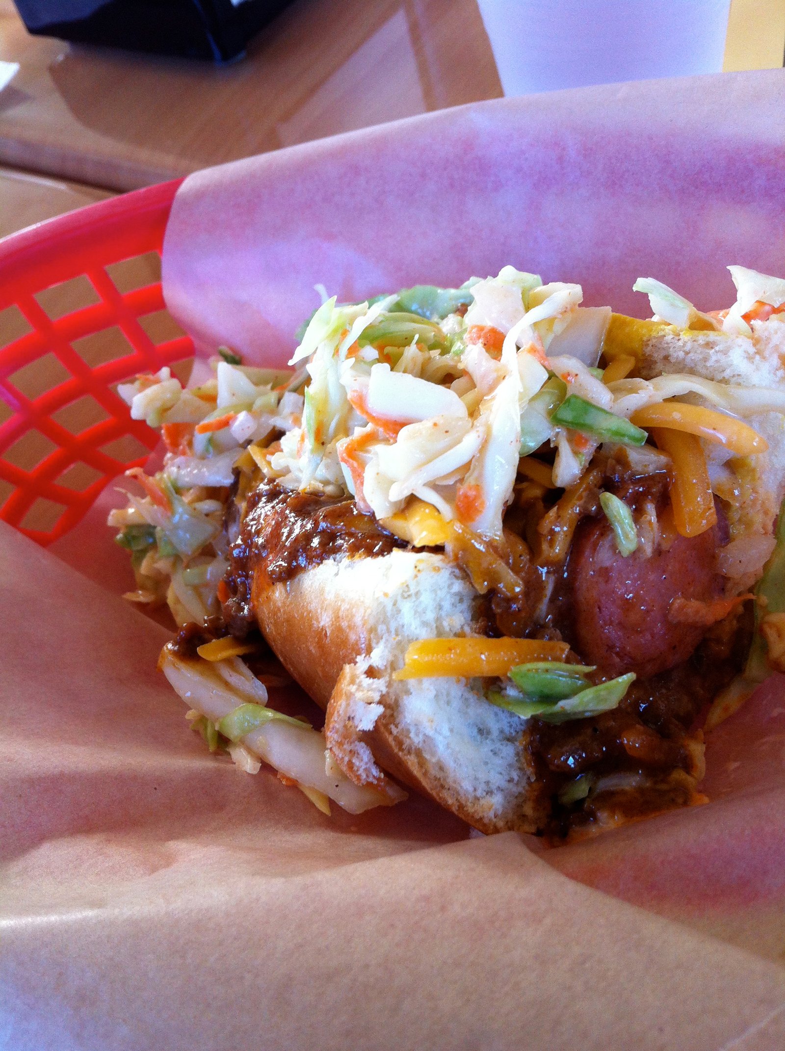 1/4 lb Vienna beef dog, beer chili, cheddar, mustard, onions and slaw ($4.99) (the only choice was between Cole Slaw or Thai Slaw, and we decided on Cole Slaw).