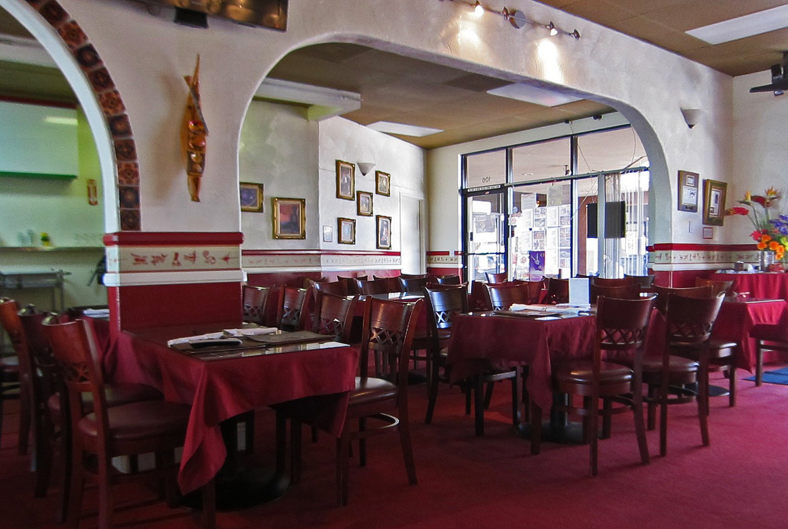 Over the years the dining furnishings have been upgraded, though the interior is still that dark red tone….