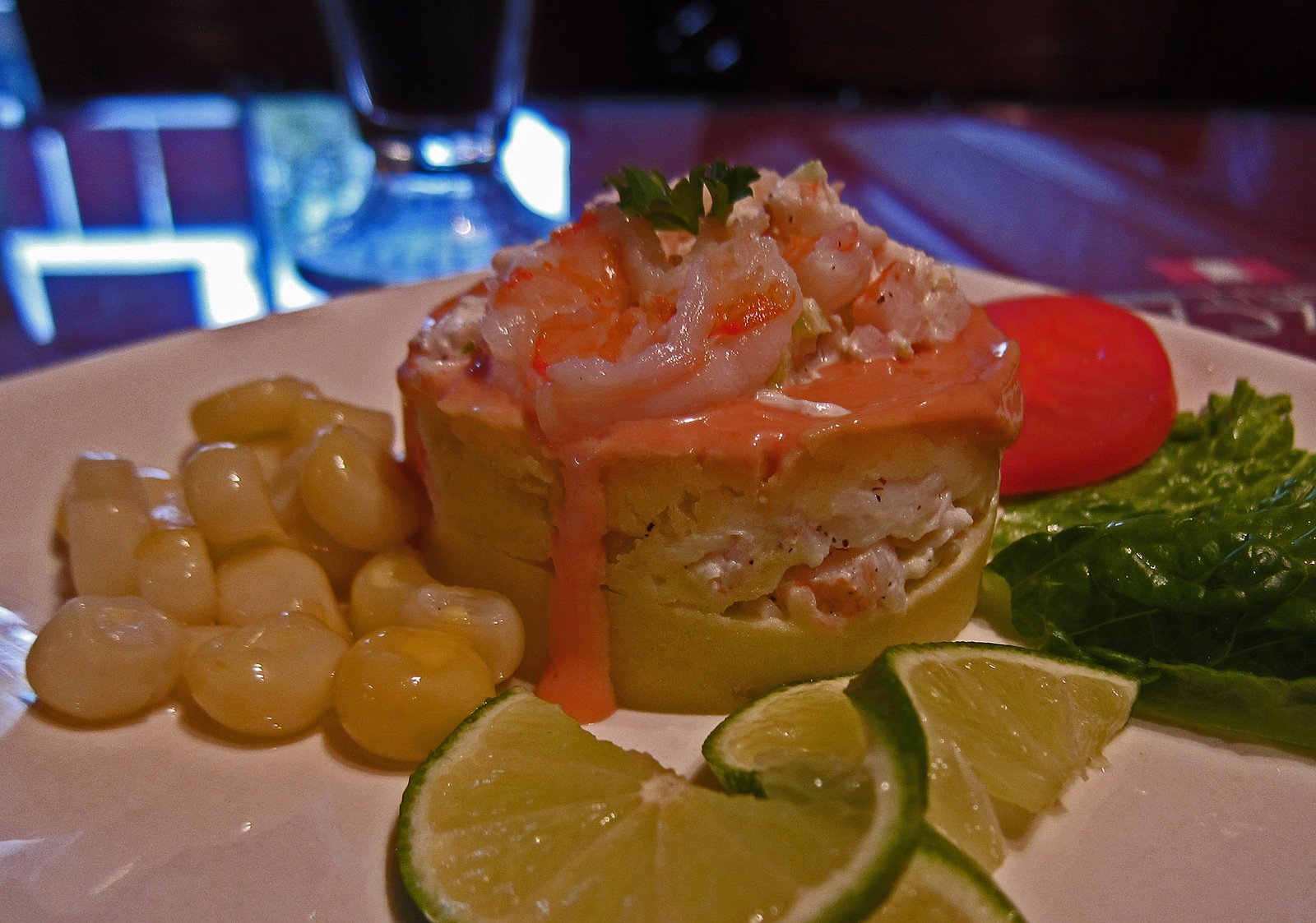 So I started with something I've enjoyed in the past. The Causa Nazca. A causa is basically a mashed potato "cake/dumpling". Peru is home of the potato, if you ever have the chance to visit, you'll find it in so many shapes and forms, from the delicious and basic papa amarilla the yellow potato, to the chuño a freeze dried tuber that has an interesting texture. The version at Nazca Grill seems similar to the layered Causa Limeña, Lima style Causa. I usually will get the shrimp version.
