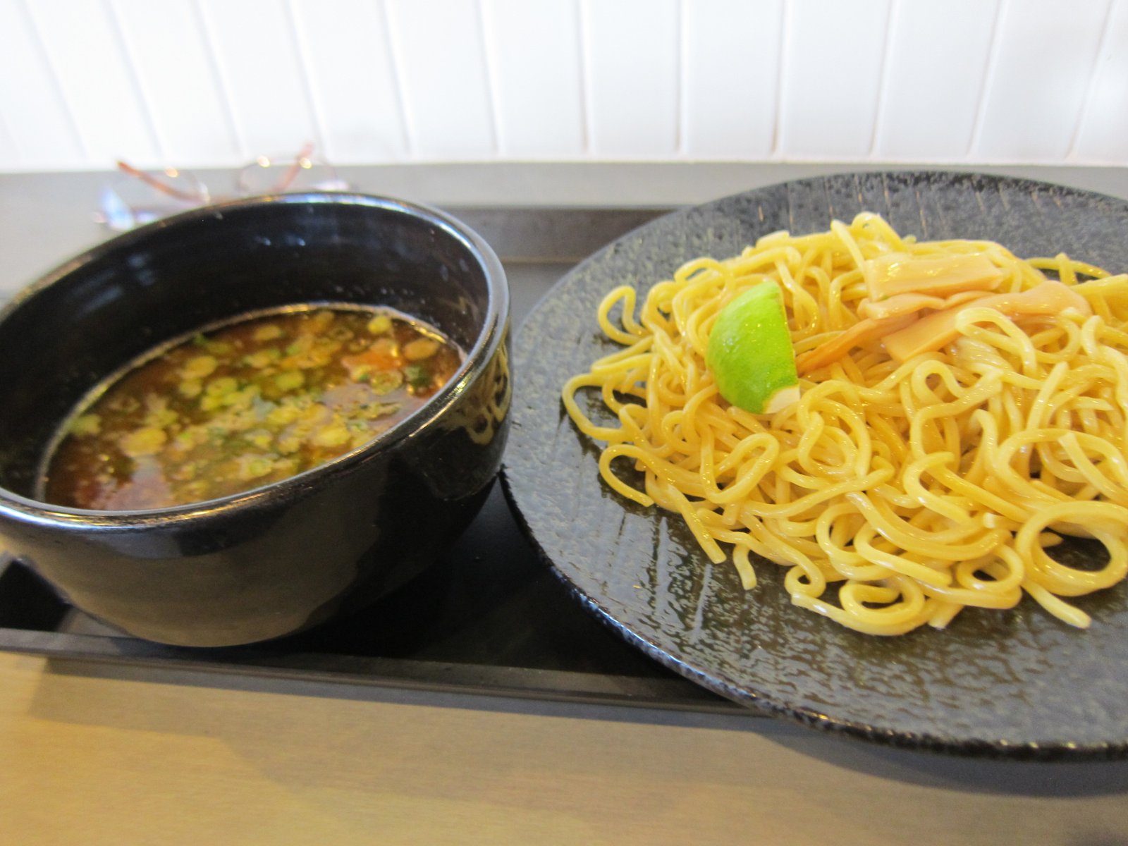 Actually, a soft opening was probably a good idea as the crew obviously needed a bit of training. After I was seated, a menu was handed to me, and then they scattered like the wind. Busy putting together menus or wiping glasses while I sat waiting to order. When I finally ordered, everything snapped together and went efficiently, perhaps a little on the too eager efficient side as my check arrived a few seconds after my Tsukemen ($8.25 then, now $8.75), which I ordered since it was zillion degrees outside.
