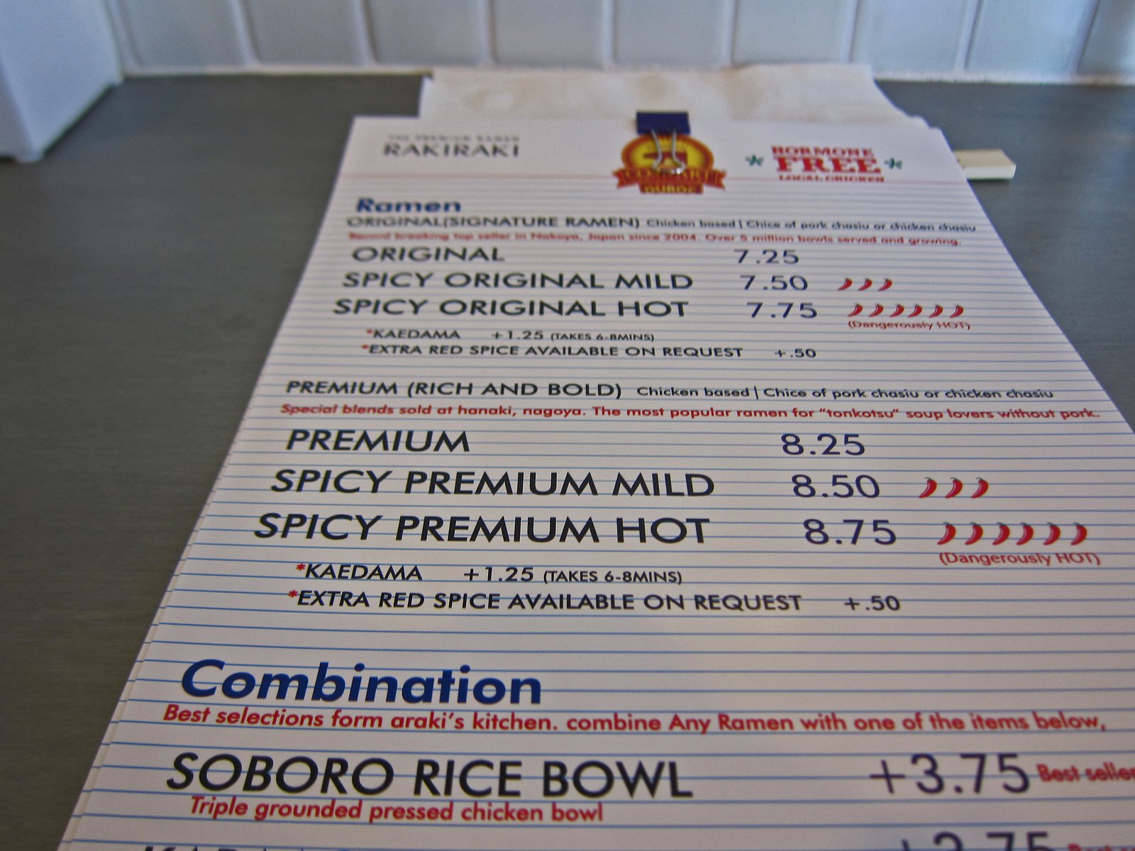 Forget about burgers, it seems that San Diego is going thru a bit of a "ramen renaissance", first Yamadaya opens and then a couple of weeks back I get an email from FOY (friend of yoso) "Faye" with a photo of RakiRaki, followed a few minutes later with a text from "YY" with almost the same photo. Add this to the Santouka's, Tajima's, Yakyudori, and even places like Red Noodle and Izakaya Sakura, with a couple of other Japanese/Sushi joints now serving ramen and you've got a major noodle-ish explosion going on.