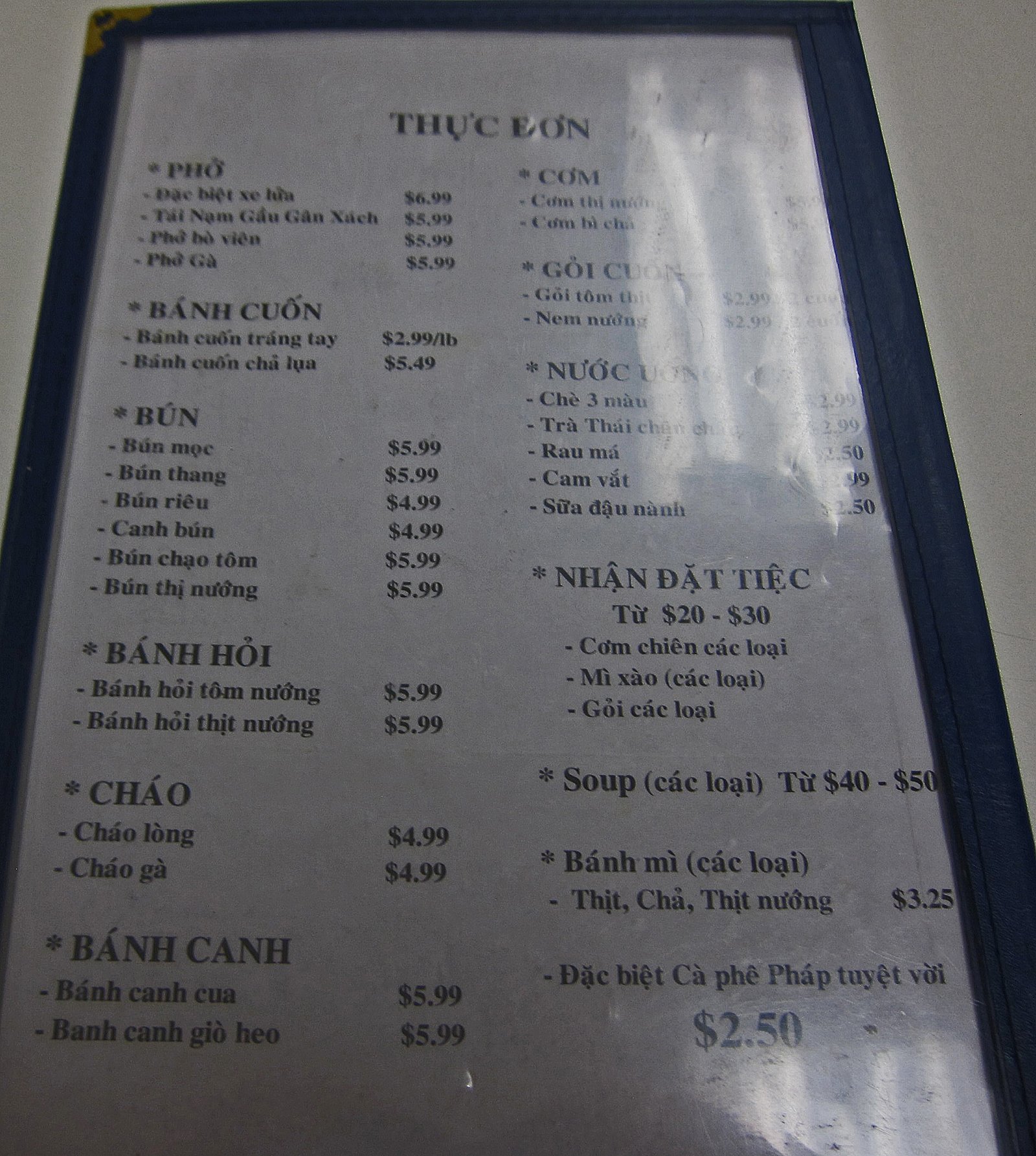 r, when things had cooled down, I decided on dropping by for an early breakfast. By this time the menu had morphed into a multi-page deal with photos. Sad thing was there was no Banh Cuon to be seen.