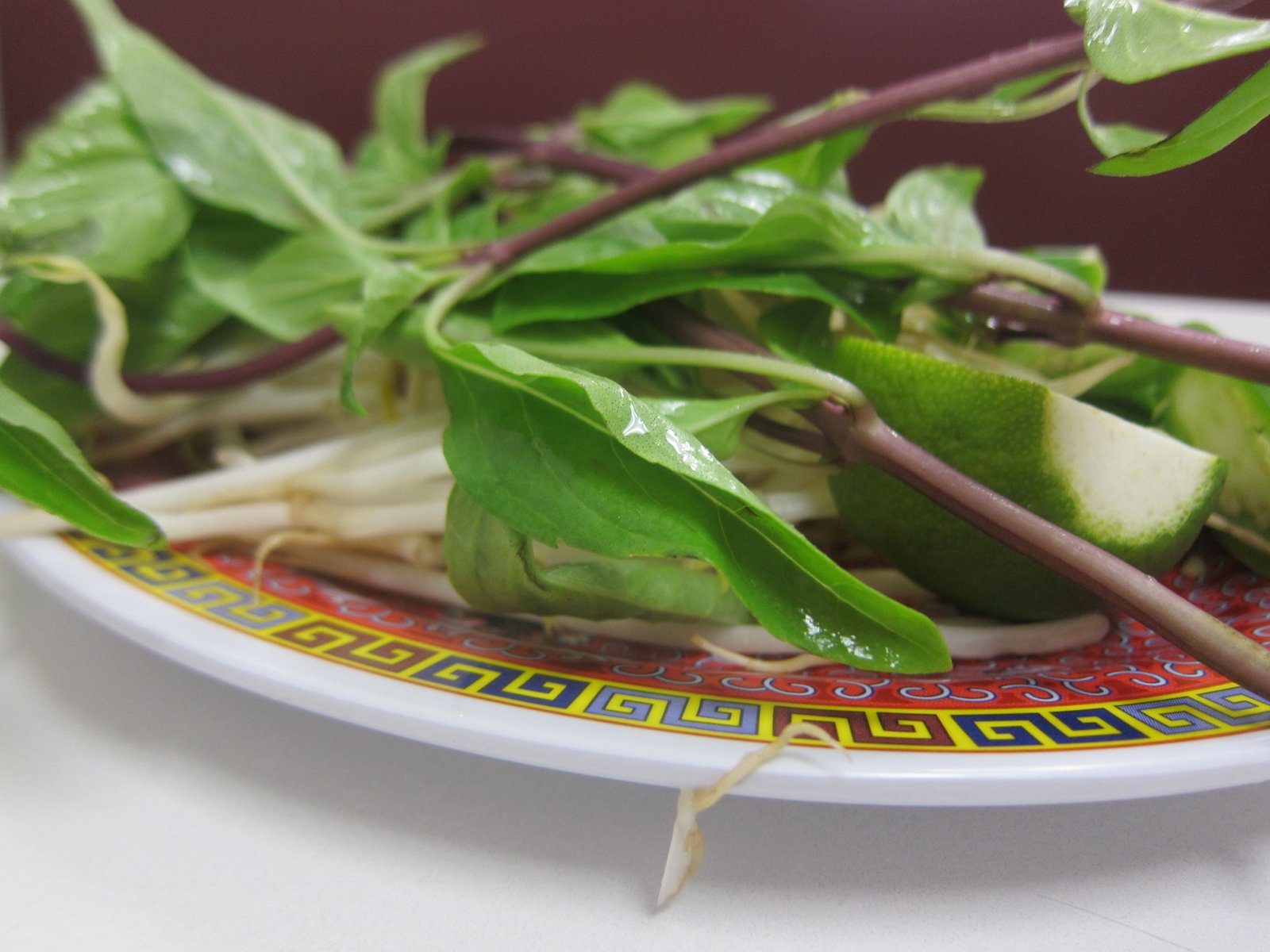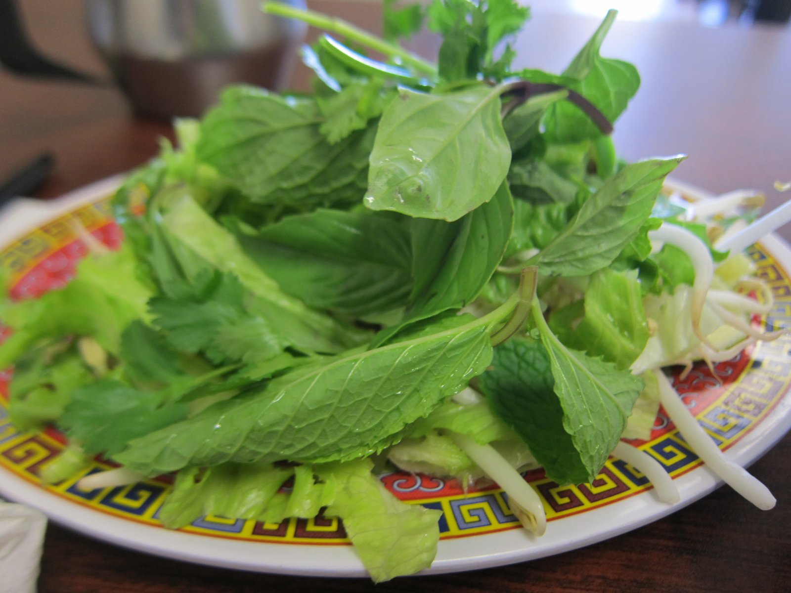 I got the bun rieu. What I really like is that different sets for herbs are served for the pho versus the bun moc, versus the bun rieu. This was a fresh assortment of rau ram, perilla, banana blossom, and even some fishy-funky diếp cá.