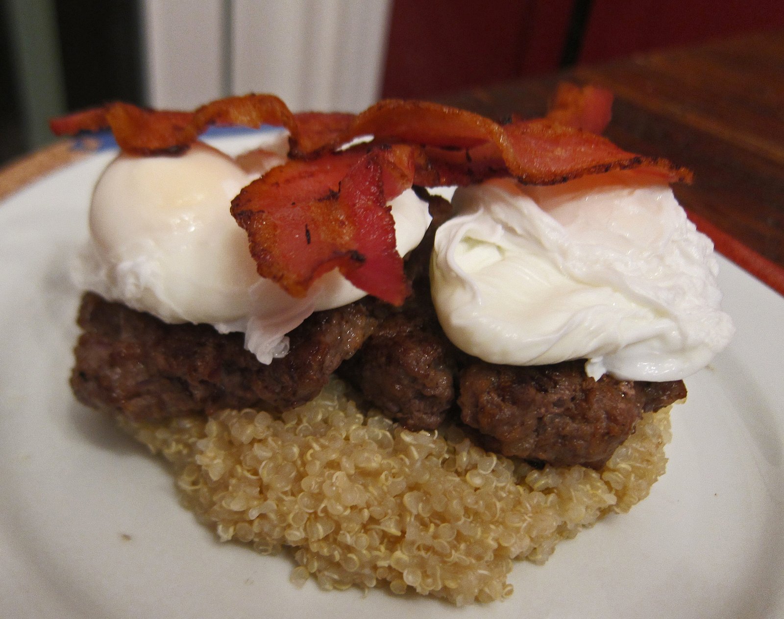 The Missus had Hers paradoxical new age style…….on quinoa, but with bacon and poached eggs (cage free vegetarian of course…sheesh!).
