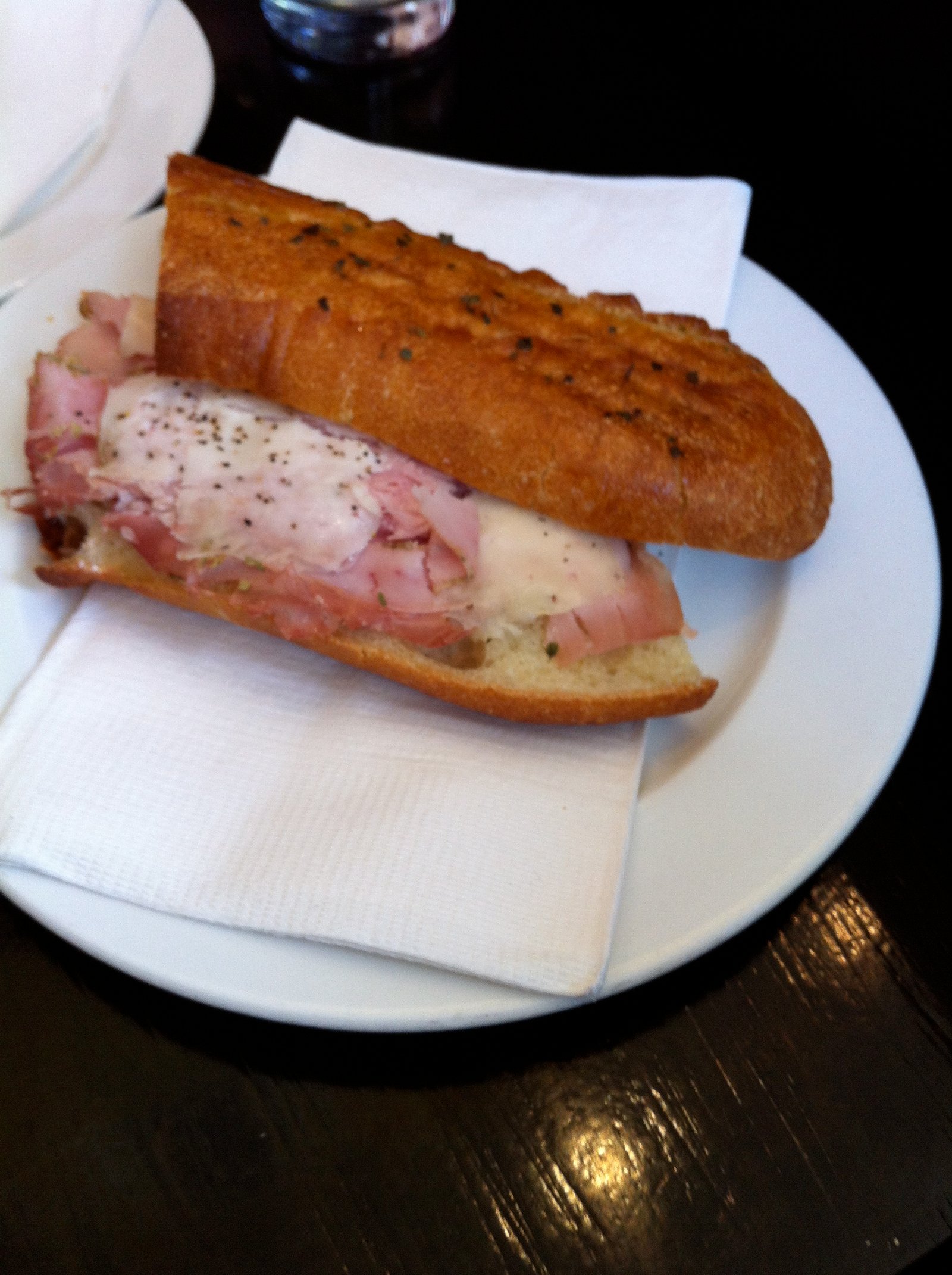 because The Mister had ordered this-a dolce-sweet. Nuttela con nocciola ($1.50)-chocolate hazelnut spread topped with chopped hazelnuts. As you can see, it was served on a small roll (with the same thin crust as the baguette) topped with powdered sugar. The nicest antithesis of a donut, ever.