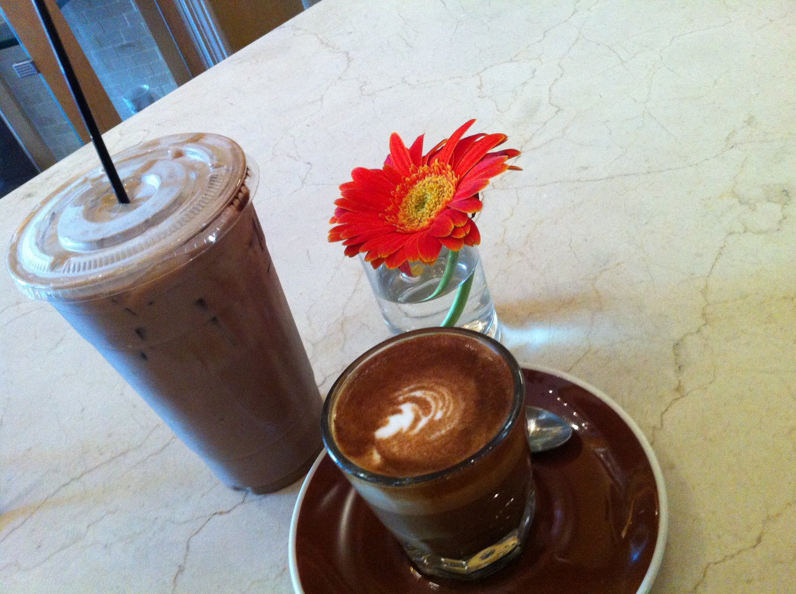 Our order- a large iced mocha and a doppio macchiatto. The mocha -chocolate and espresso- was good and had enough caffiene to make cc hyper for most of the evening. The double shot of espresso topped with a 'kiss' of milk foam was deep flavored yet I could detect a sweetness to the steam pressured coffee without having to add any sugar.
