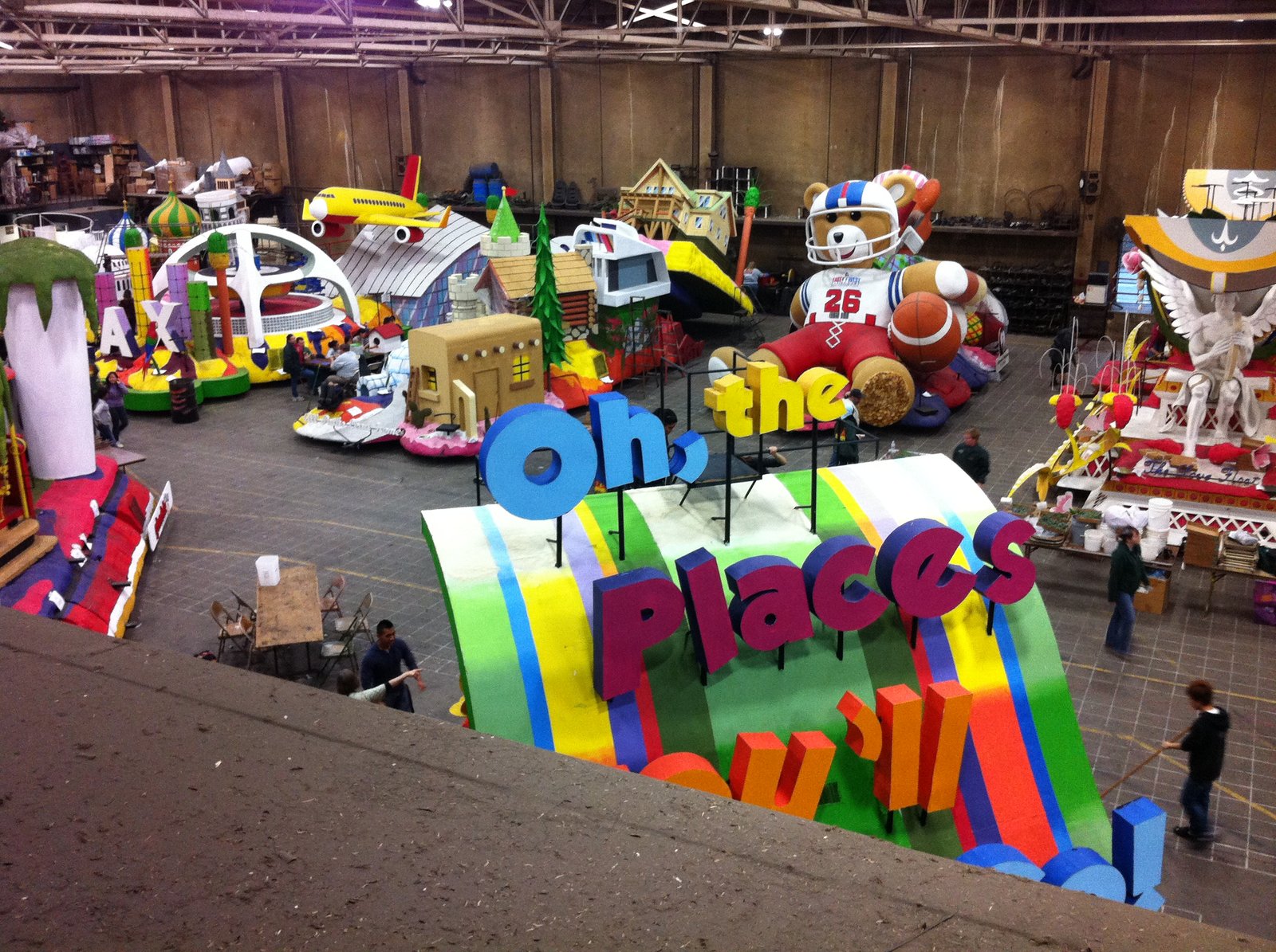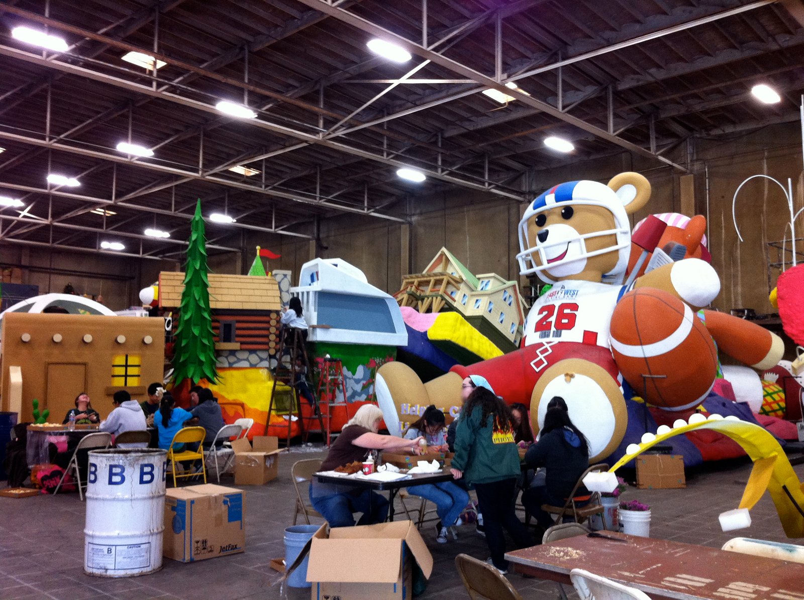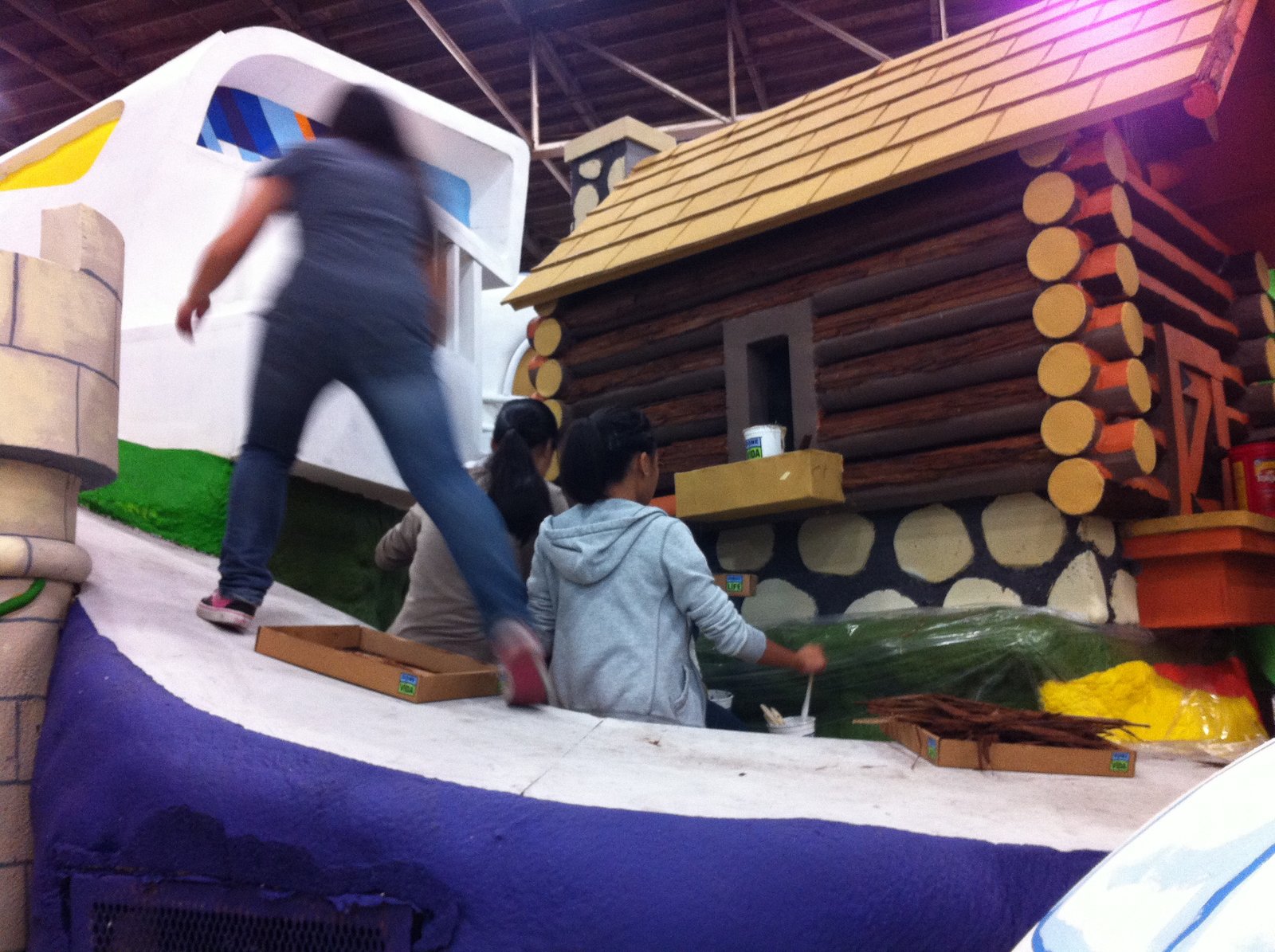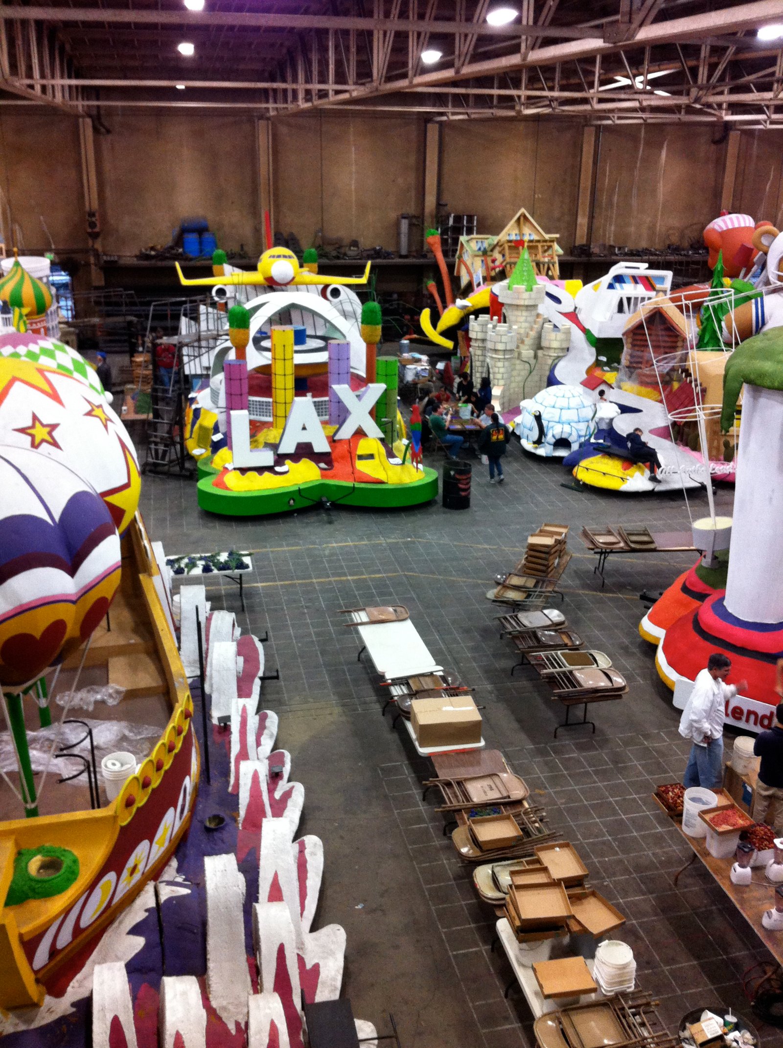 Walking into the Phoenix Decorating Company Rose Palace, eleven floats were parked. Of course, this barn is not heated and we were glad we wore layers. You'll notice in almost every photo, everyone is wearing jackets, sweaters and sweatshirts. (There is one photo of a guy in shorts, but he has on a lined jacket).