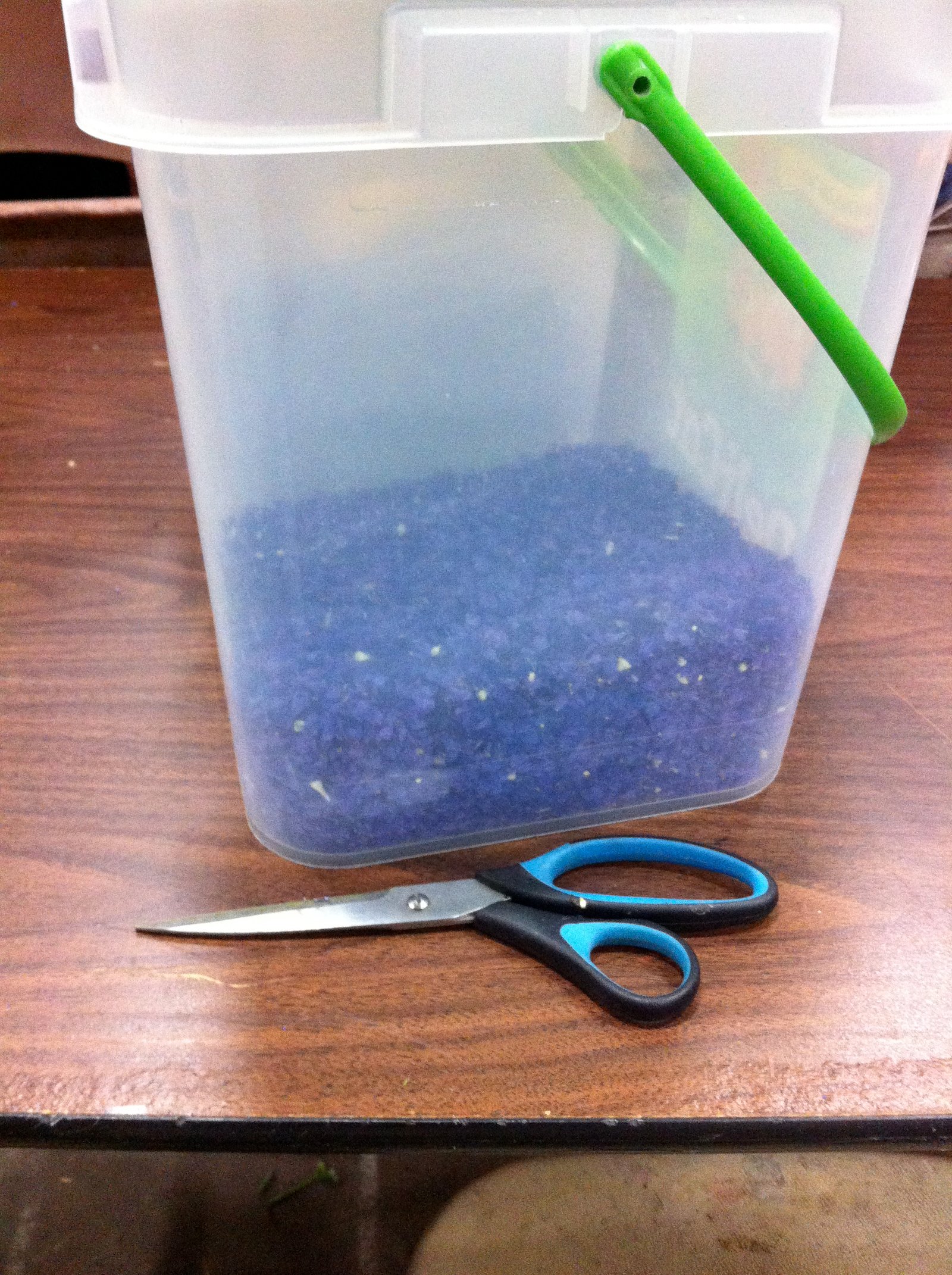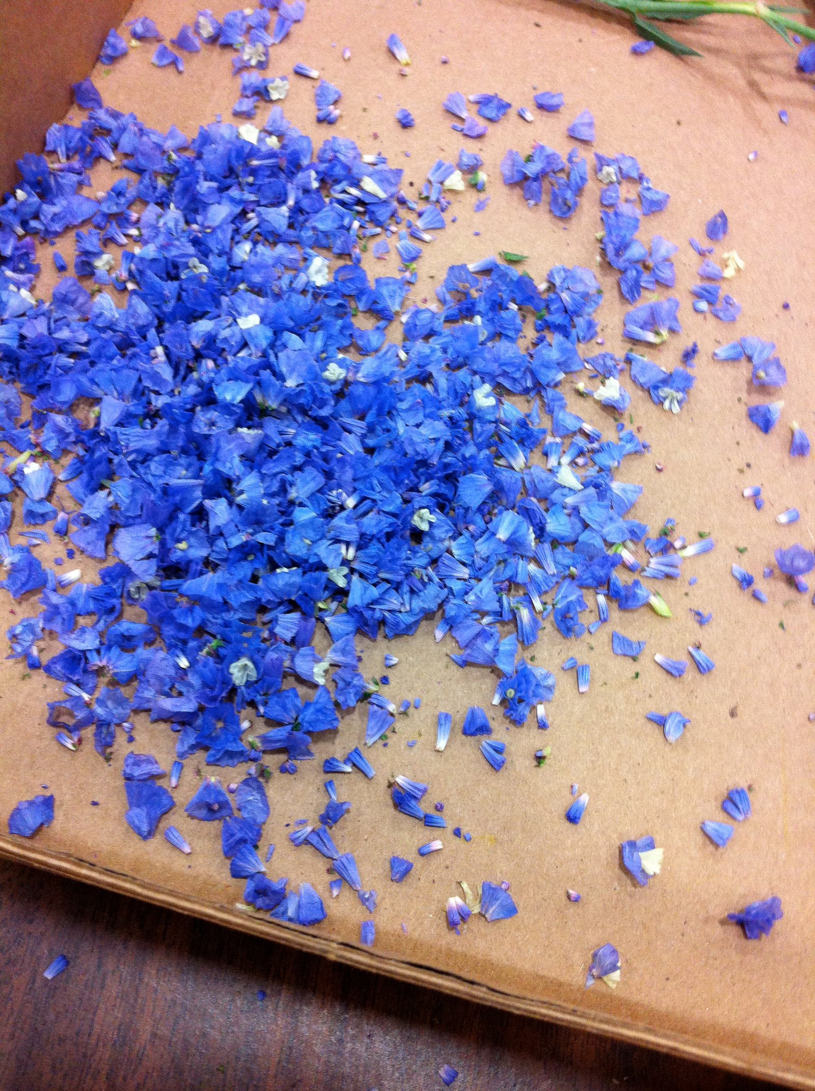 This looks like three colors to you, right? Well, each of those buckets of flowers got to be divided further, so the various shades of 'blues' 'purples', as well as 'pink' colors could be used on specific areas of the floats. This is how the darkest statice colors got divided: