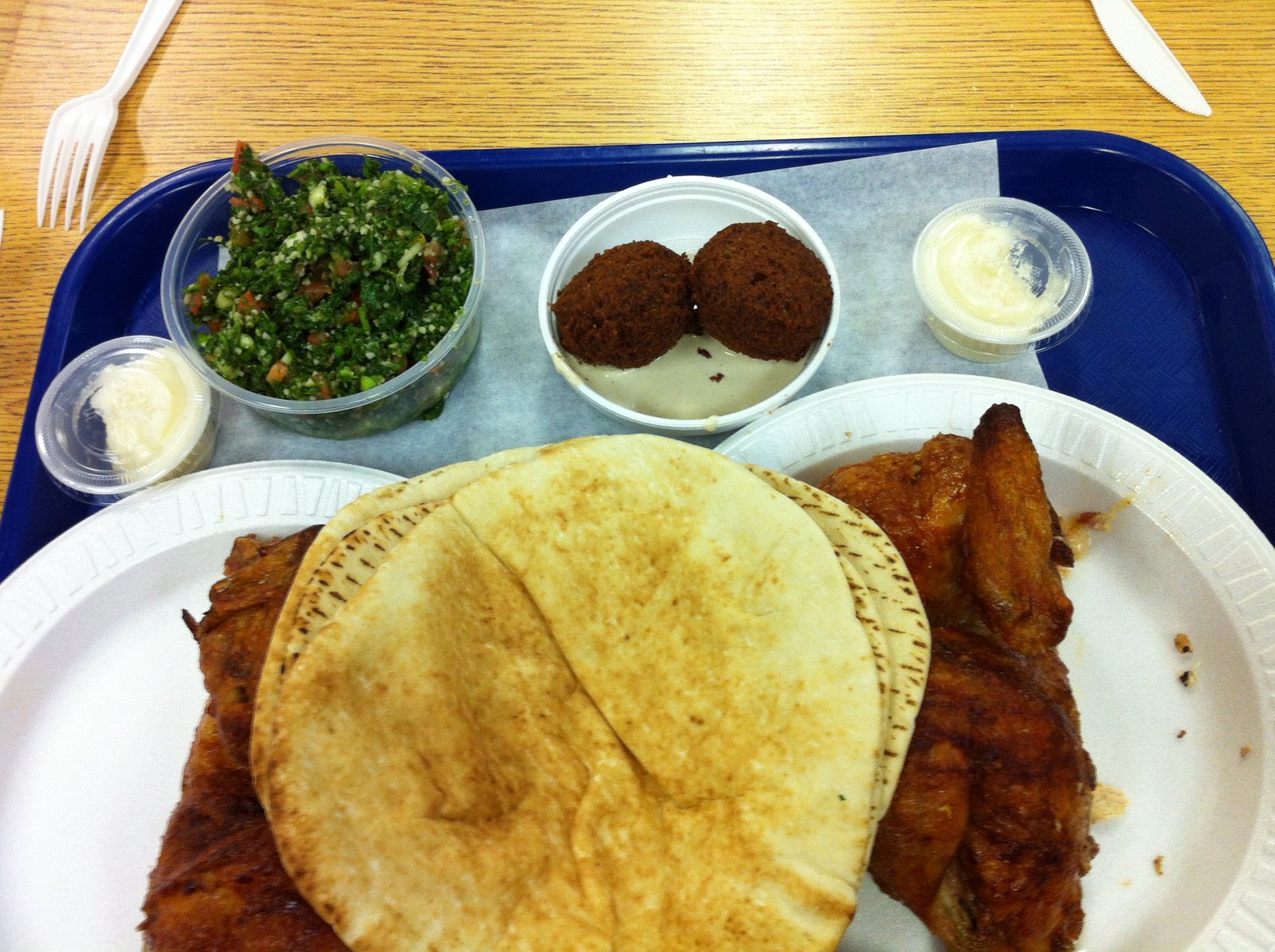 Of course, we decided to order the name of the restaurant…and chose a whole chicken, which was cut in half for us. It came with 4 fresh pita breads and a 'powerful garlic sauce'- (it's firmly whipped; not saucy) ($9.99). We also ordered a small (8 oz) tabbouleh salad ($3.49) and a side of two fresh falafel ($1.35). Everything was excellent. The chicken was moist with crispy skin..and wonderfully complimented by the 'powerful garlic sauce' (that's the signage description; I now refer to it as 'magic garlic'). The falafel were on top of a good amount of fresh tahini sauce and light with a good, thin crisp crust…and seemed to have a familiar spice in them…maybe cinnamon. These were very good. The tabbouleh was so fresh and flavorful, the parsley, onion, tomato and bulghur topped with lemon juice and olive oil was so refreshing. We finished it all and were ready for our two hour drive home.