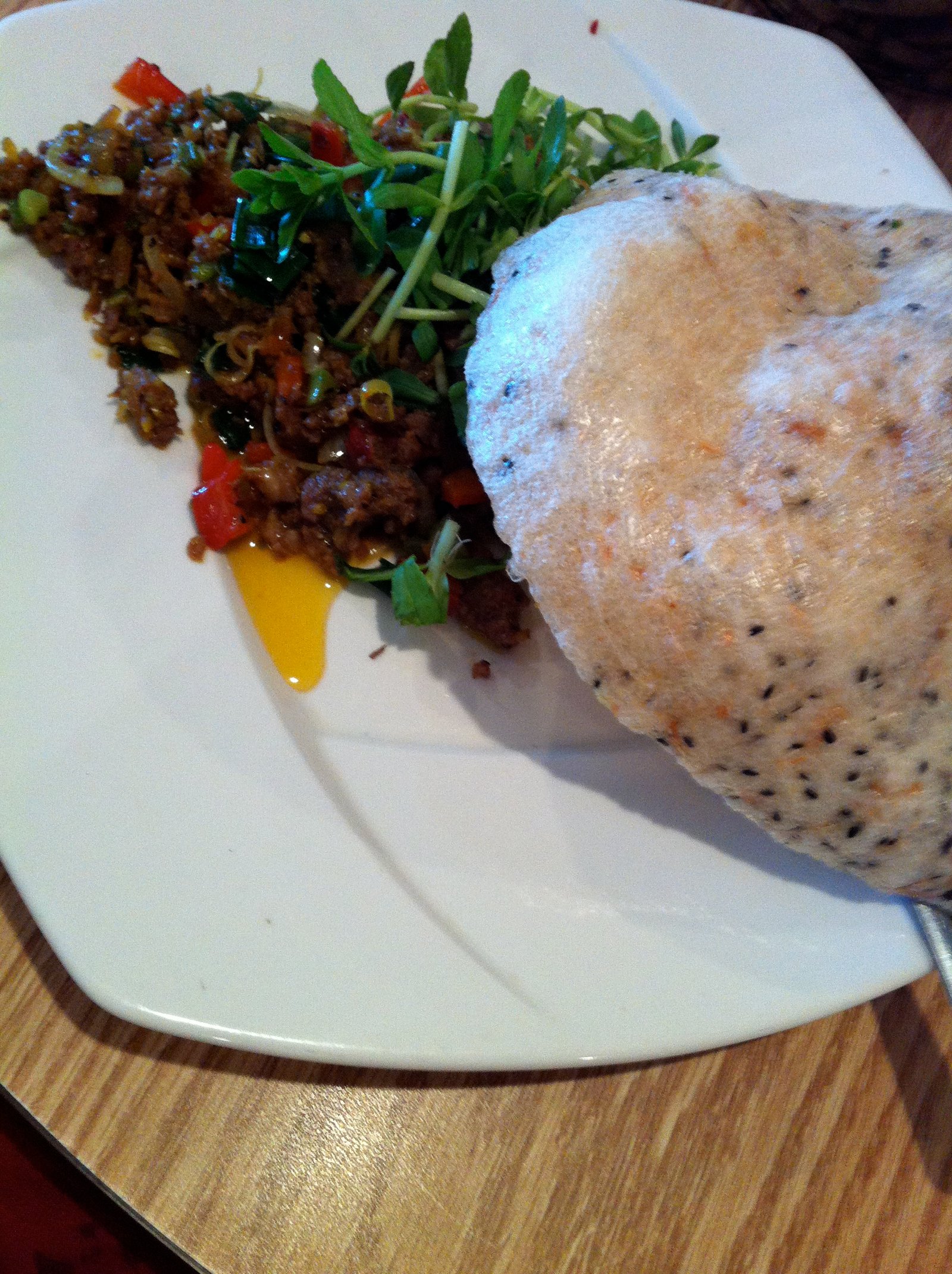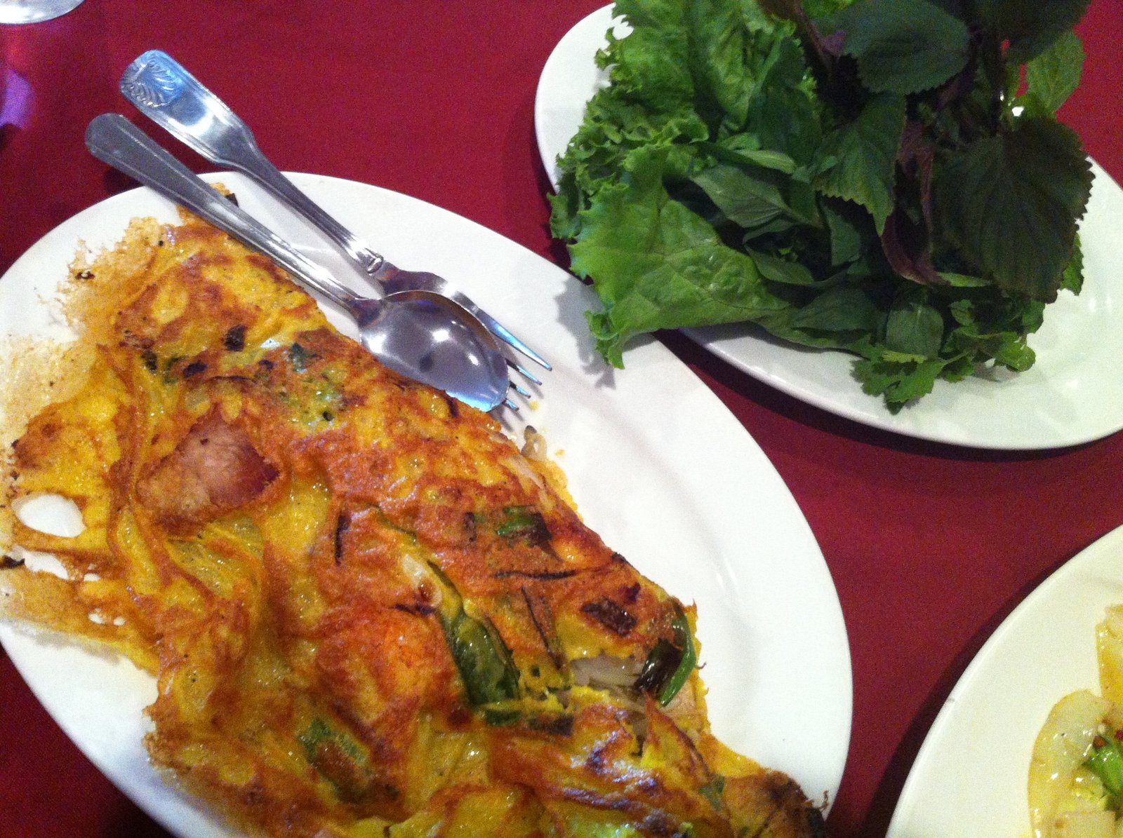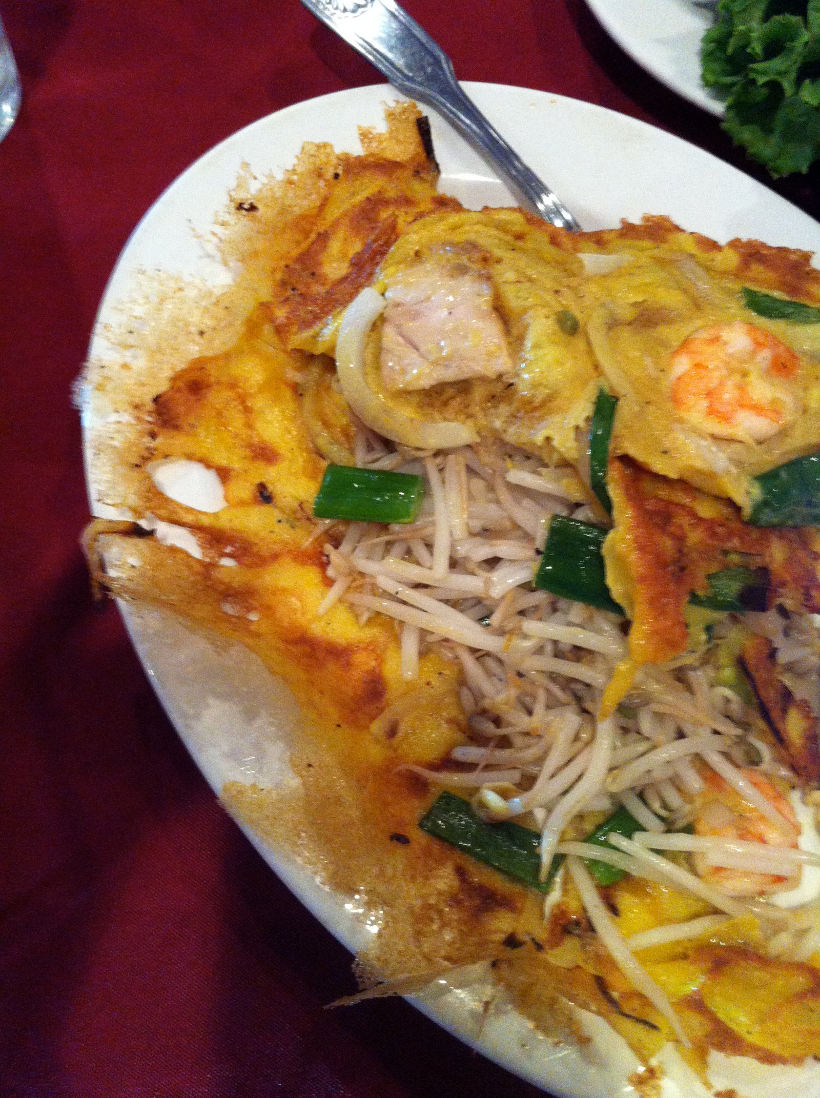 A perfect light, crispy, rice flour-turmeric based pancake, filled with bean sprout, onion, pork and shrimp. Airy and crispy, wrapped in lettuce leaves with mint added. An excellent version.