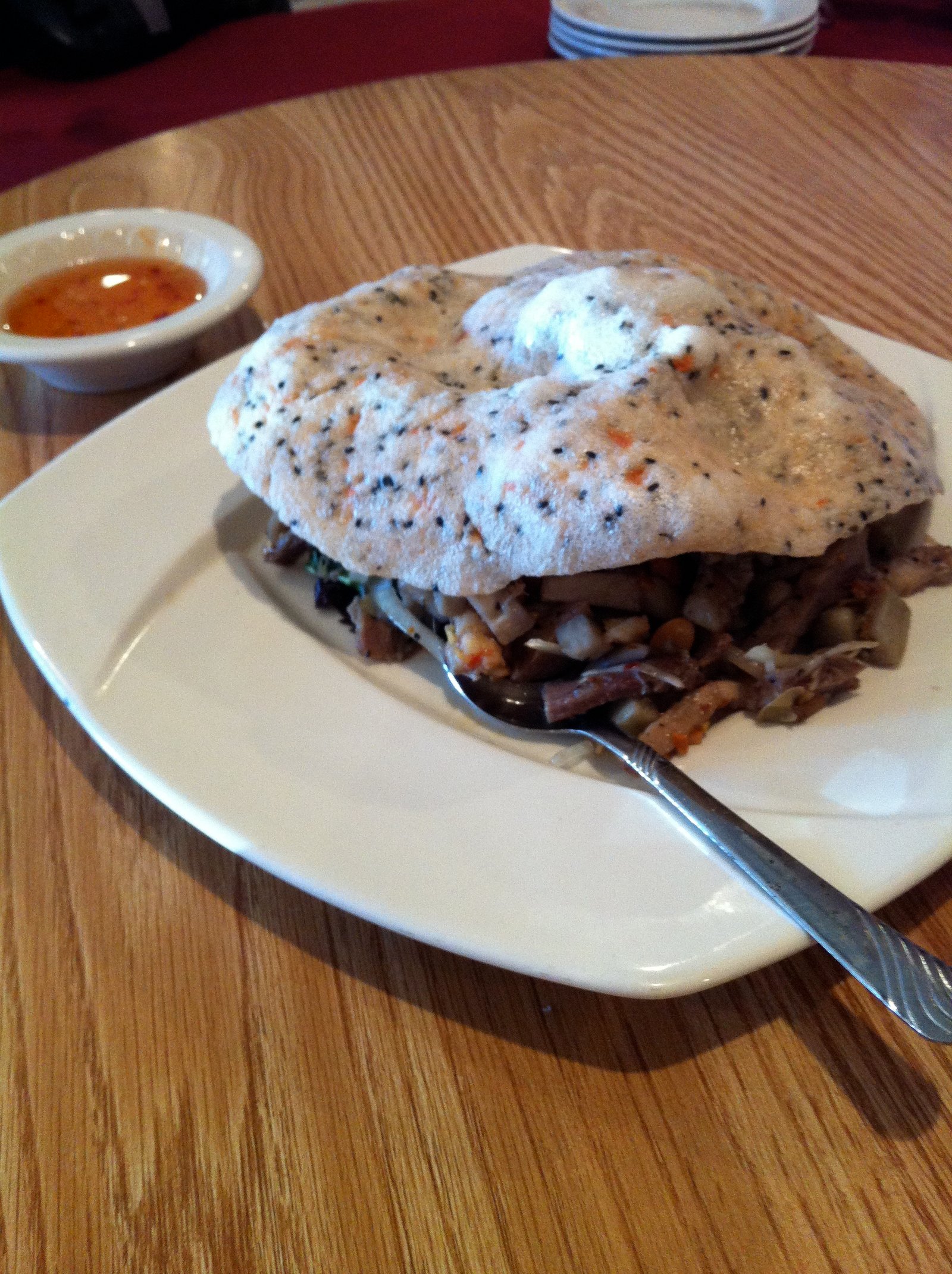 This was a salad of minced wild boar sauteed with lemongrass and red and green peppers, topped with the sesame rice cracker. The herb on top has a cumin flavor. This was surprisingly wonderful and mildly addictive. The boar flavor wasn't too distinct or odd…I got more texture out of it and enjoyed the melding of all the flavors.