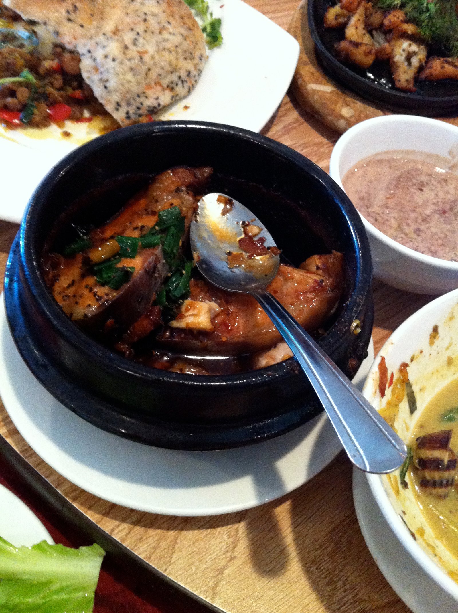 Above is the catfish Hot Pot, photographed after some of the contents had been removed and the sizzle had stopped. The fish was tender and fresh flavored (not muddy, as sometimes happens with catfish) and a piece of pork belly lined the bottom of the pot. The sauce was sticky of course, but had a deep flavor of fish sauce in addition to the sweet. I wish I wasn't so full and could have eaten more. All in all, great food shared with great friends.